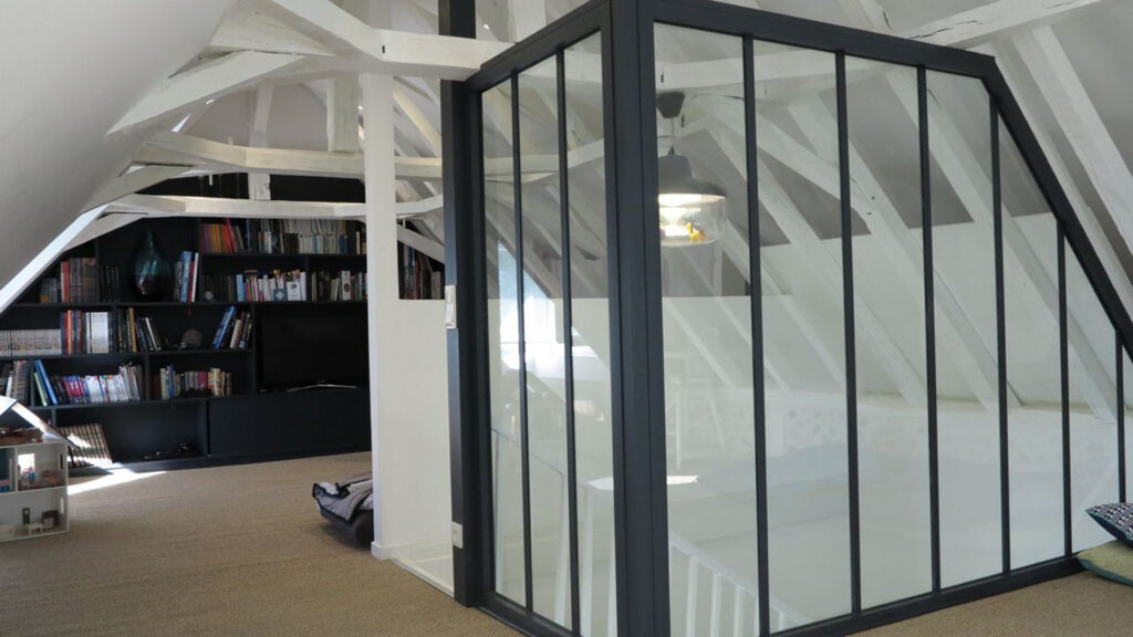 La pièce maîtresse du projet est sans conteste la cage d’escalier habillée d’une verrière en acier noir. Structure à la fois technique et sculpturale, elle joue un rôle central dans la circulation de la lumière naturelle à travers le niveau. L’acier noir des profilés dialogue avec la blancheur des rampants et les poutres de charpente apparentes, créant une esthétique industrielle et contemporaine parfaitement accordée au caractère authentique du bâti ancien.