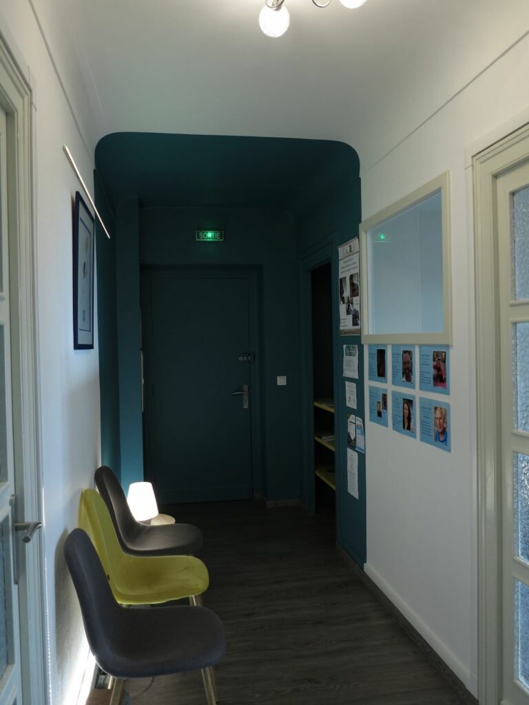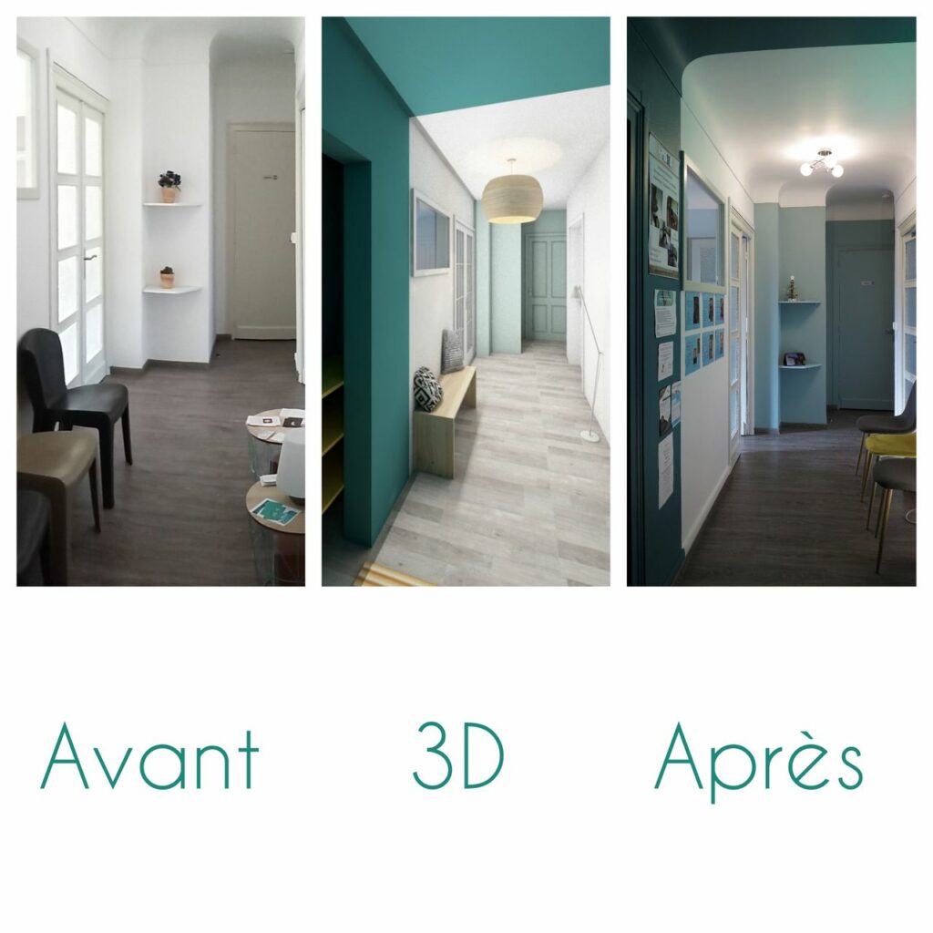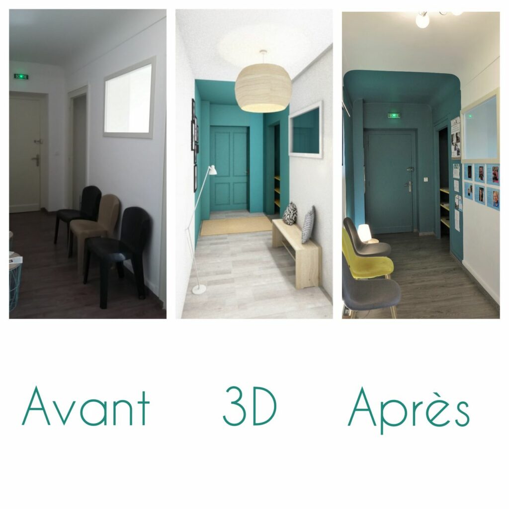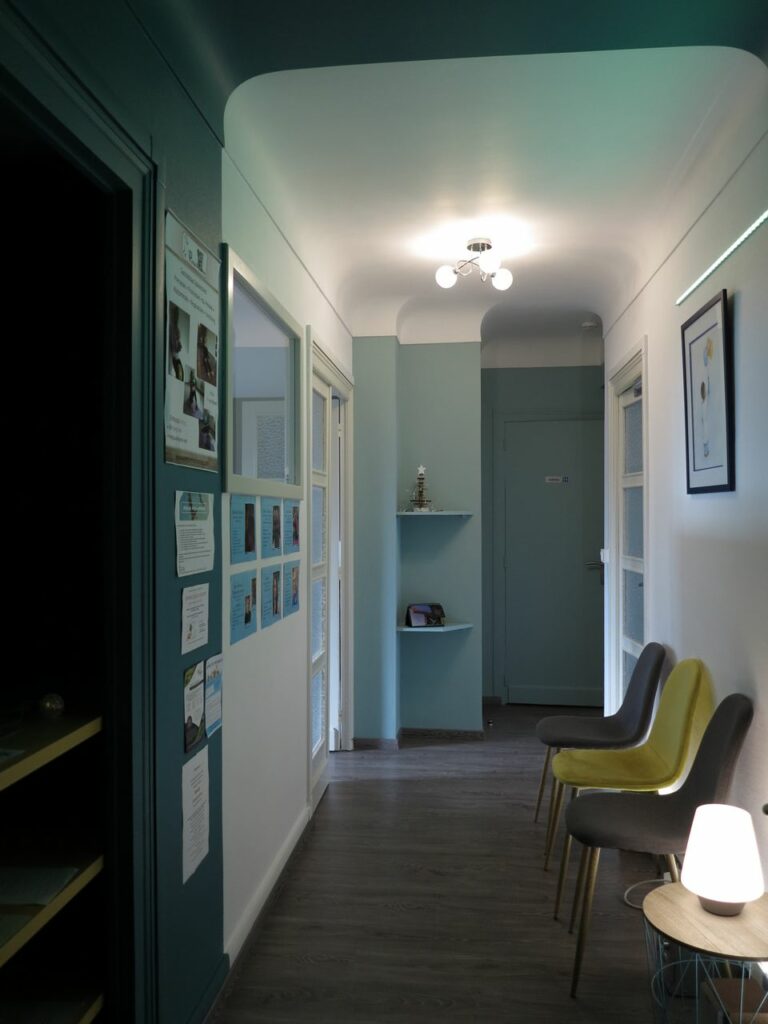 Pour répondre à cette demande de cohérence de marque, notre agence a structuré sa réponse autour de la psychologie des environnements. Nous avons analysé la nouvelle charte graphique de Laurent Helle afin de la traduire fidèlement en volumes, en textures et en lumières. Ce travail de transposition a débuté par une étude chromatique rigoureuse. Le choix des peintures ne s’est pas limité à une simple application esthétique ; nous avons sélectionné des nuances capables de dialoguer avec les supports de communication du cabinet (site web, cartes de visite, logo), tout en veillant à ce que ces teintes favorisent un état de relaxation profonde. L’objectif était de créer une continuité visuelle sans couture, où le patient retrouve l’univers du praticien dès le pas de la porte.