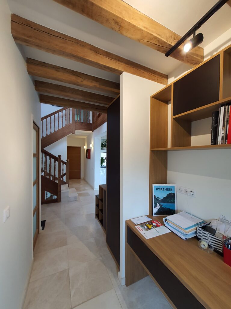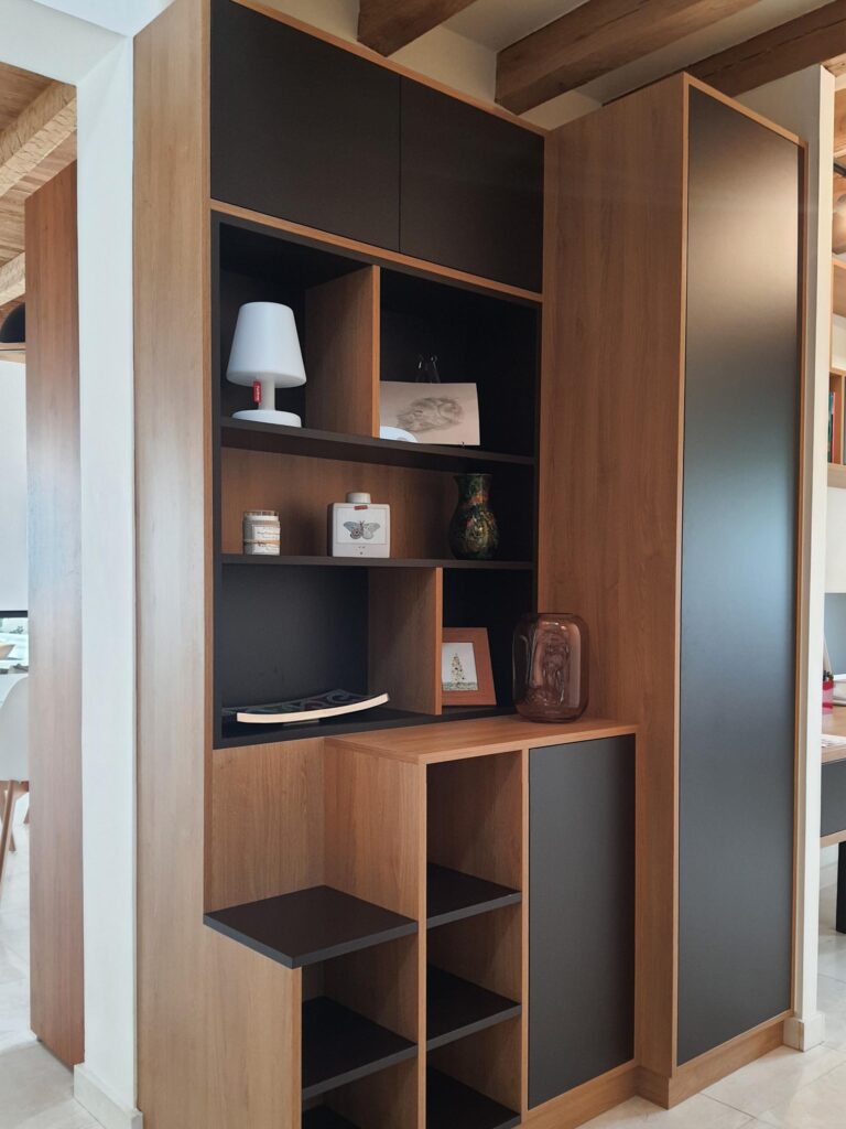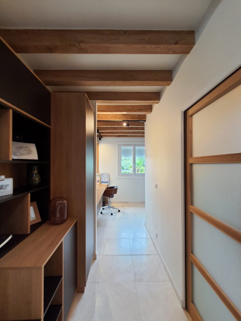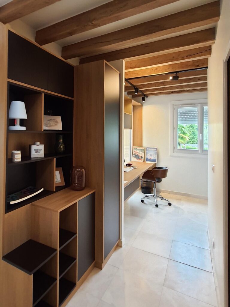 Le bureau-entrée joue une tout autre partition, résolument sobre et fonctionnelle. Les poutres en bois apparent au plafond imposent leur présence et confèrent au lieu un caractère authentique que l’aménagement sur mesure est venu sublimer. La bibliothèque intégrée en bois naturel et teinte graphite structure l’espace sur toute la hauteur sous plafond, offrant rangements ouverts et fermés, plan de travail encastré et espace de circulation fluide. Chaque module a été pensé pour s’adapter précisément aux volumes et aux usages, entre stockage, exposition et espace de travail concentré.