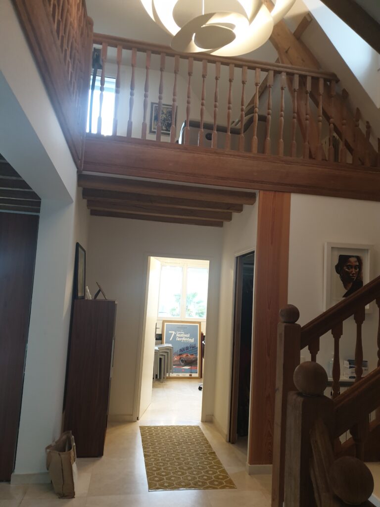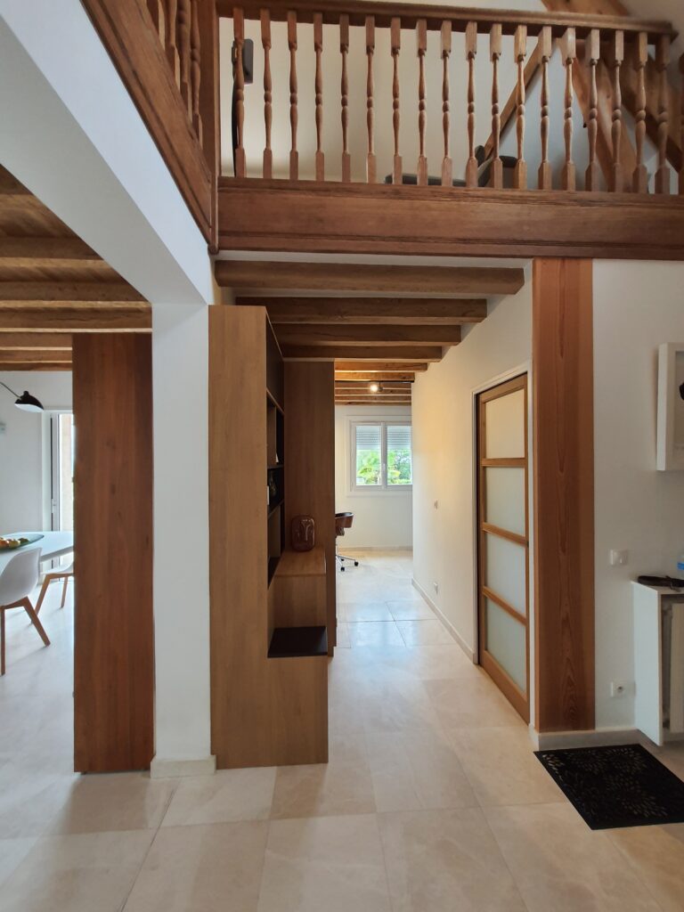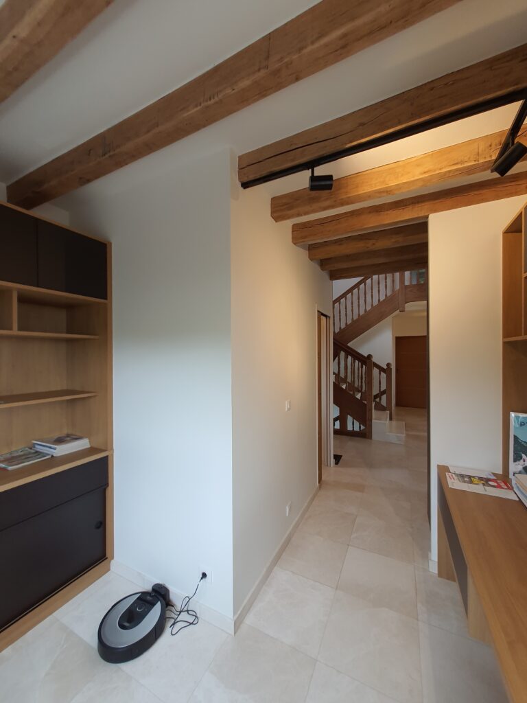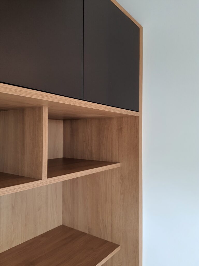 Le bureau-entrée joue une tout autre partition, résolument sobre et fonctionnelle. Les poutres en bois apparent au plafond imposent leur présence et confèrent au lieu un caractère authentique que l’aménagement sur mesure est venu sublimer. La bibliothèque intégrée en bois naturel et teinte graphite structure l’espace sur toute la hauteur sous plafond, offrant rangements ouverts et fermés, plan de travail encastré et espace de circulation fluide. Chaque module a été pensé pour s’adapter précisément aux volumes et aux usages, entre stockage, exposition et espace de travail concentré.