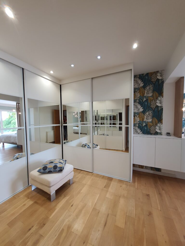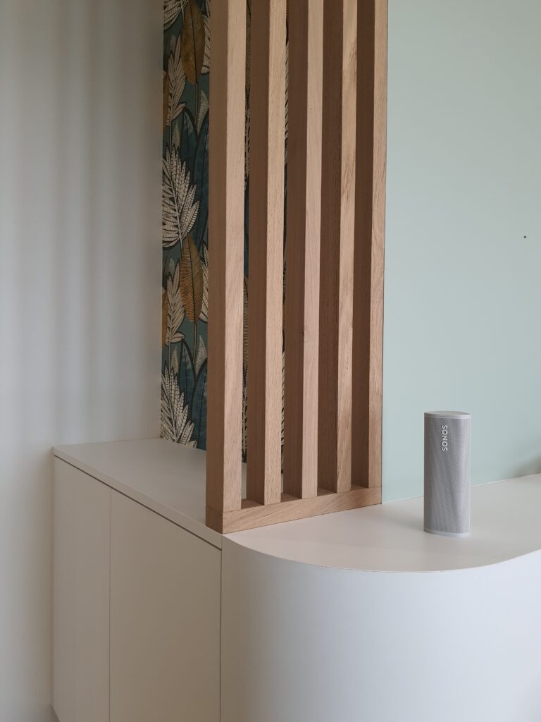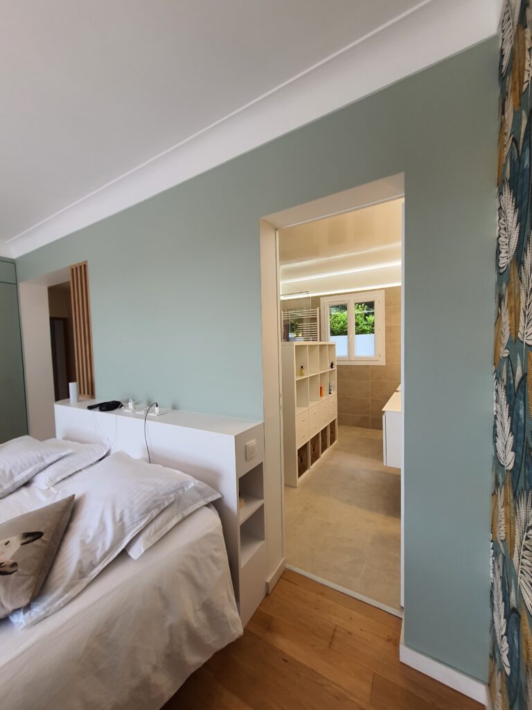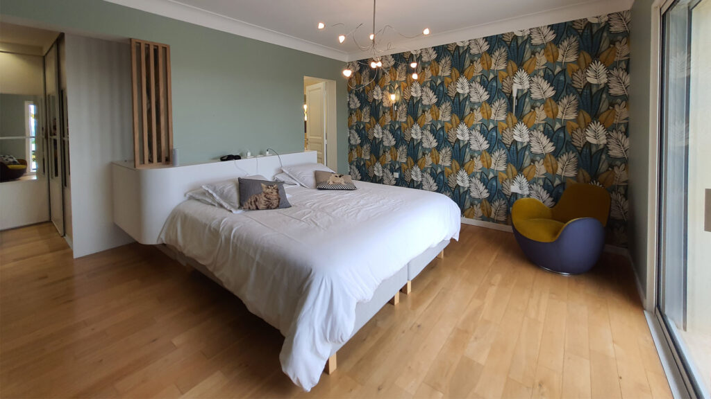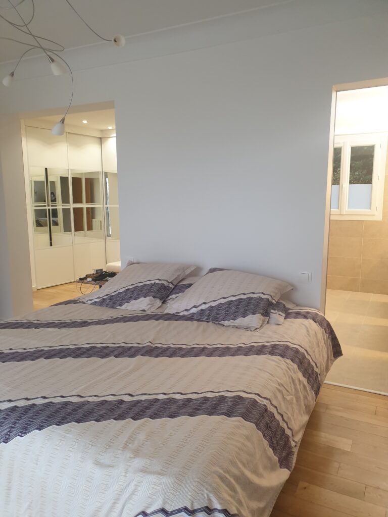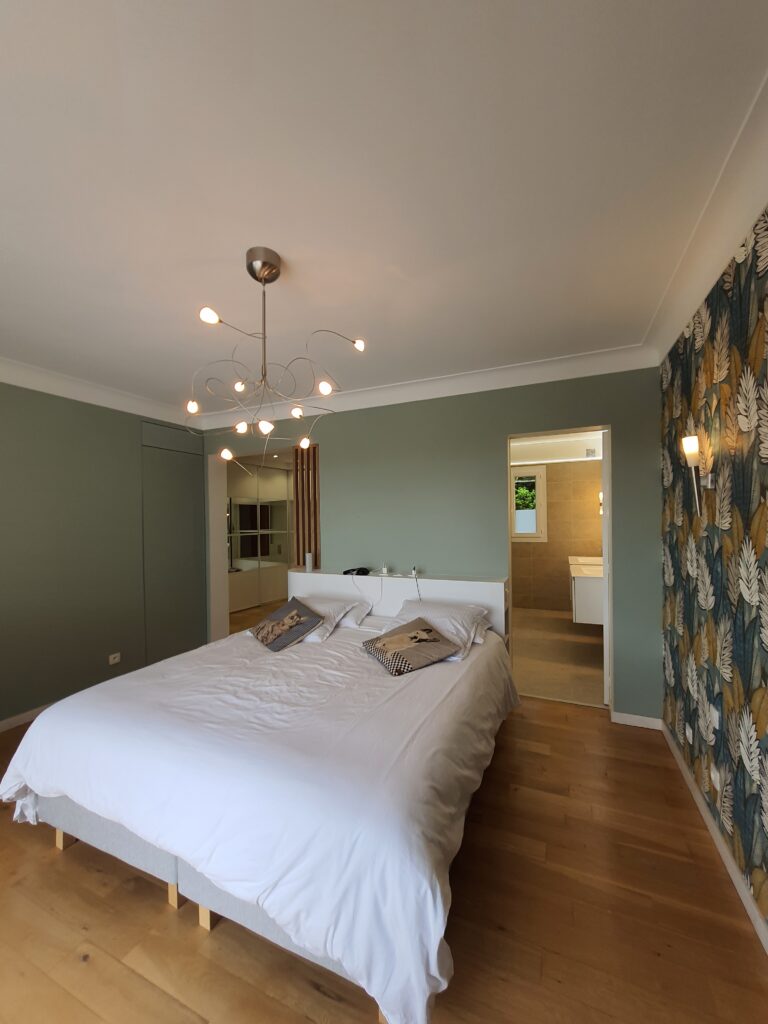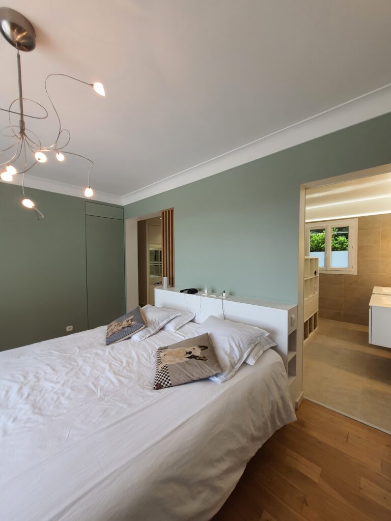 Un seul projet, deux espaces, deux atmosphères. C’est la double mission confiée à ADK Architecture sur ce chantier d’un mois : rénover une chambre parentale avec création d’une tête de lit sur mesure, et transformer un bureau-entrée en espace de travail élégant et fonctionnel grâce à des aménagements intégrés.