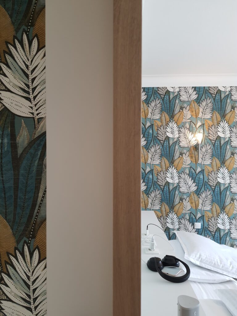 La chambre s’impose d’emblée par son caractère affirmé. Le mur de tête de lit a été habillé d’un papier peint botanique grand format aux tons bleu nuit, vert forêt et ocre doré – une composition luxuriante et enveloppante qui donne immédiatement le ton. La tête de lit sur mesure, sobre et élégante, s’inscrit en continuité naturelle de ce décor. Les rideaux en lin à larges rayures terracotta et naturel encadrent les fenêtres avec ampleur, apportant chaleur et hauteur à l’ensemble. Le parquet bois clair, les murs vert sauge doux et le linge de lit blanc immaculé complètent une palette chromatique à la fois sophistiquée et reposante – un vrai cocon contemporain.