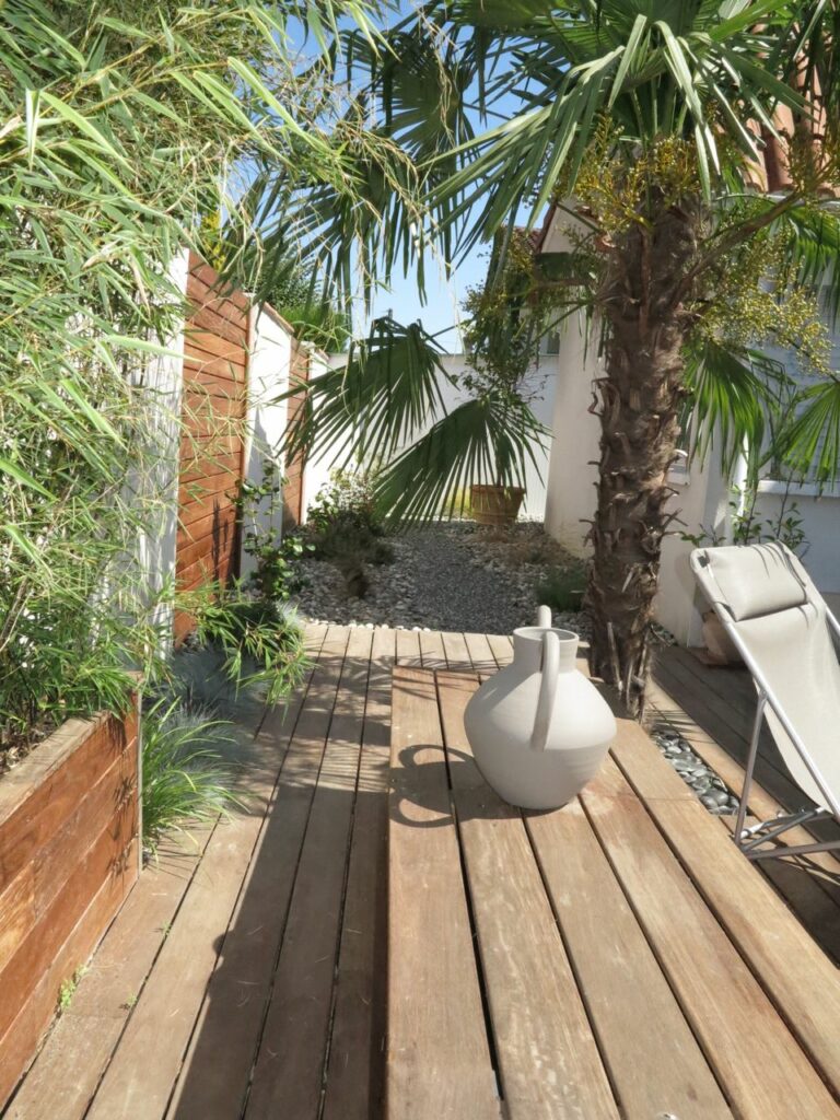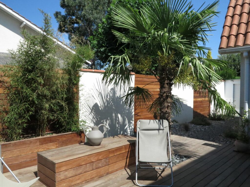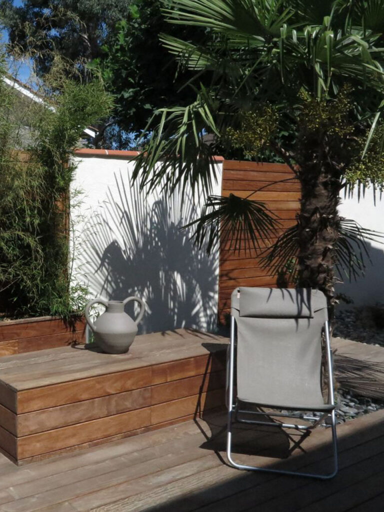 Les palmiers existants, majestueux et généreux, ont été magnifiquement mis en scène comme éléments structurants du projet. La végétalisation complémentaire, choisie pour sa résistance au climat local et son caractère graphique, densifie les massifs tout en maintenant la lisibilité de l’ensemble. Les clôtures en bardage bois vertical apportent chaleur, intimité et cohérence visuelle à l’ensemble de la propriété.