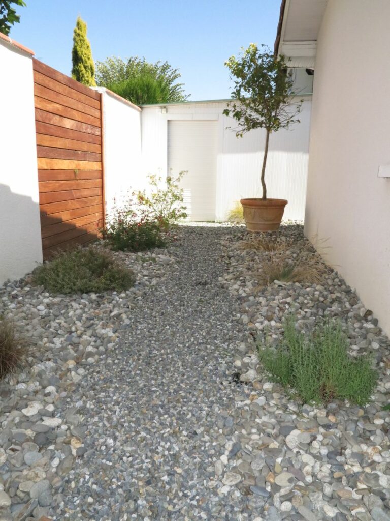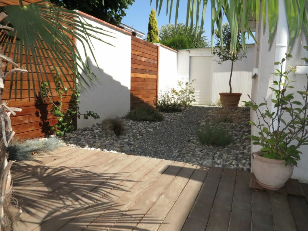 Autour de la véranda, le jardin a été entièrement restructuré selon une logique de zones complémentaires. La terrasse en bois exotique chaleureux apporte une continuité naturelle avec l’intérieur, tandis que les espaces minéraux – dalles larges format, graviers et galets soigneusement composés – créent des allées de circulation claires et des zones de repos faciles d’entretien. Ce choix stratégique de matériaux minéraux répond à une exigence forte des clients : un jardin beau au quotidien, sans contrainte d’entretien excessive.