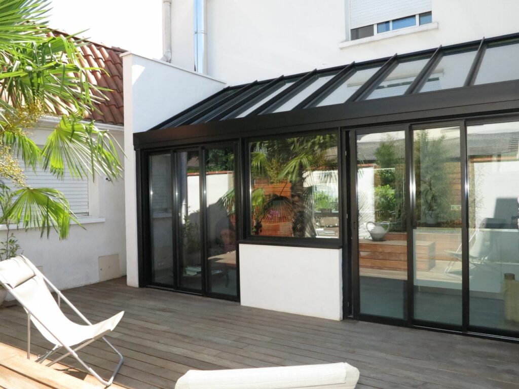 La véranda constitue la pièce centrale du projet. Conçue en acier et verre, avec sa structure noire élancée, elle crée un lien fluide et lumineux entre l’intérieur de la maison et le jardin. Espace de vie supplémentaire à part entière, elle offre un usage quatre saisons – salon d’été, salle à manger prolongée, espace de détente – tout en s’intégrant harmonieusement à l’architecture existante de la maison.