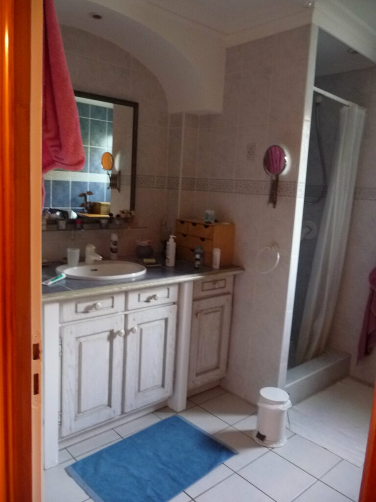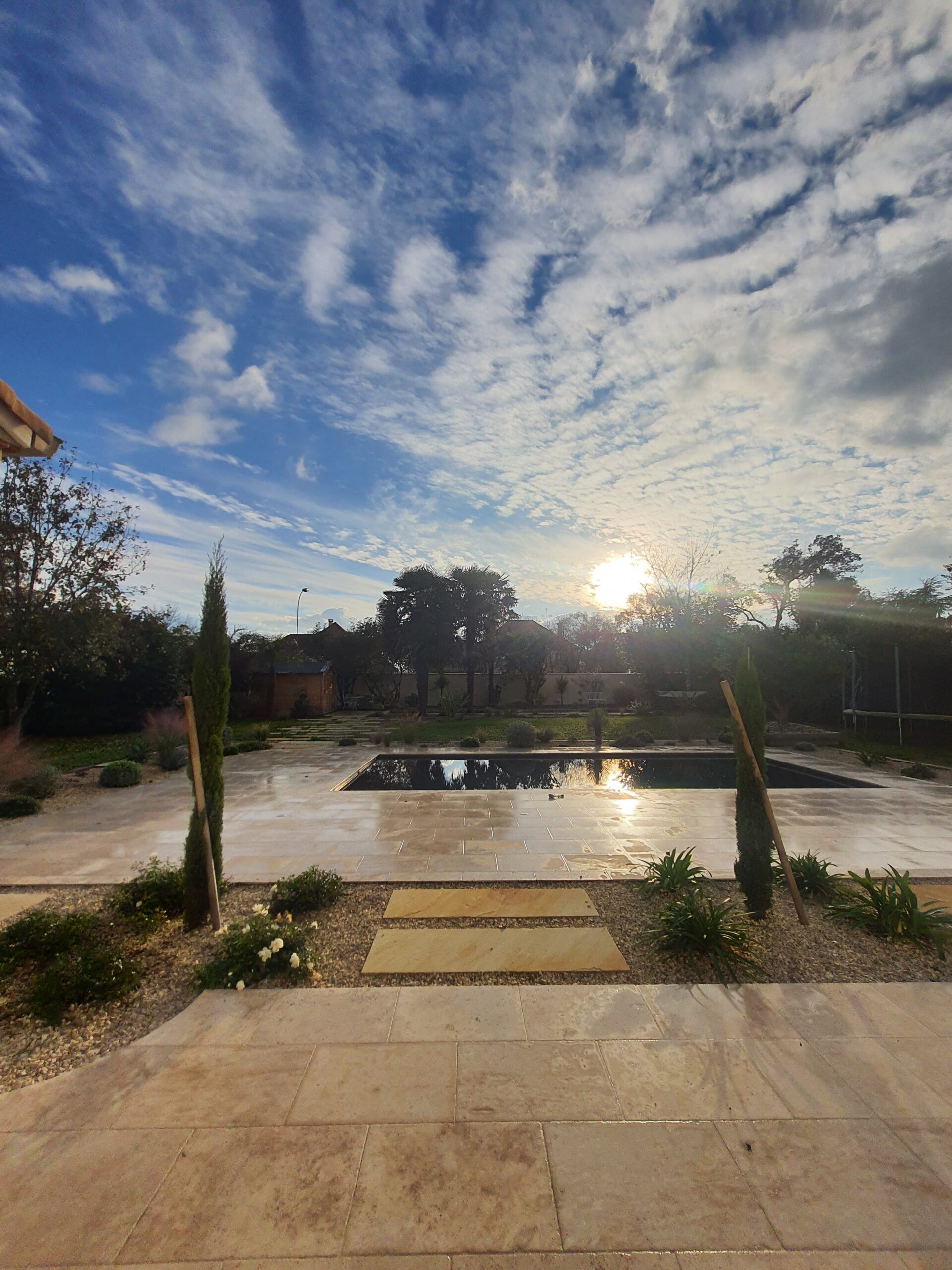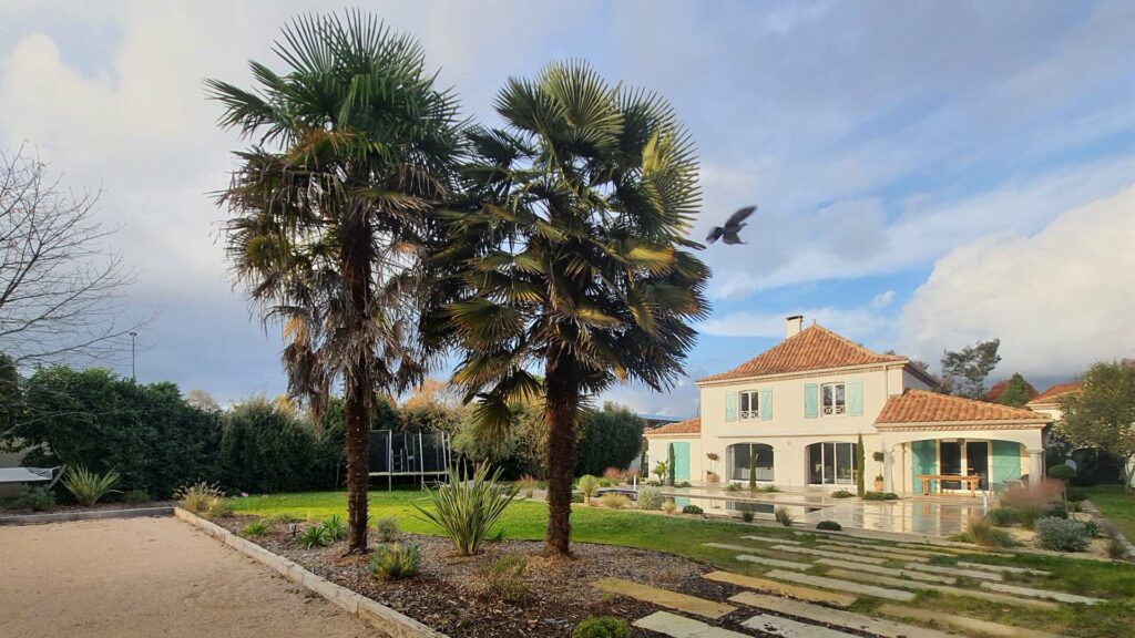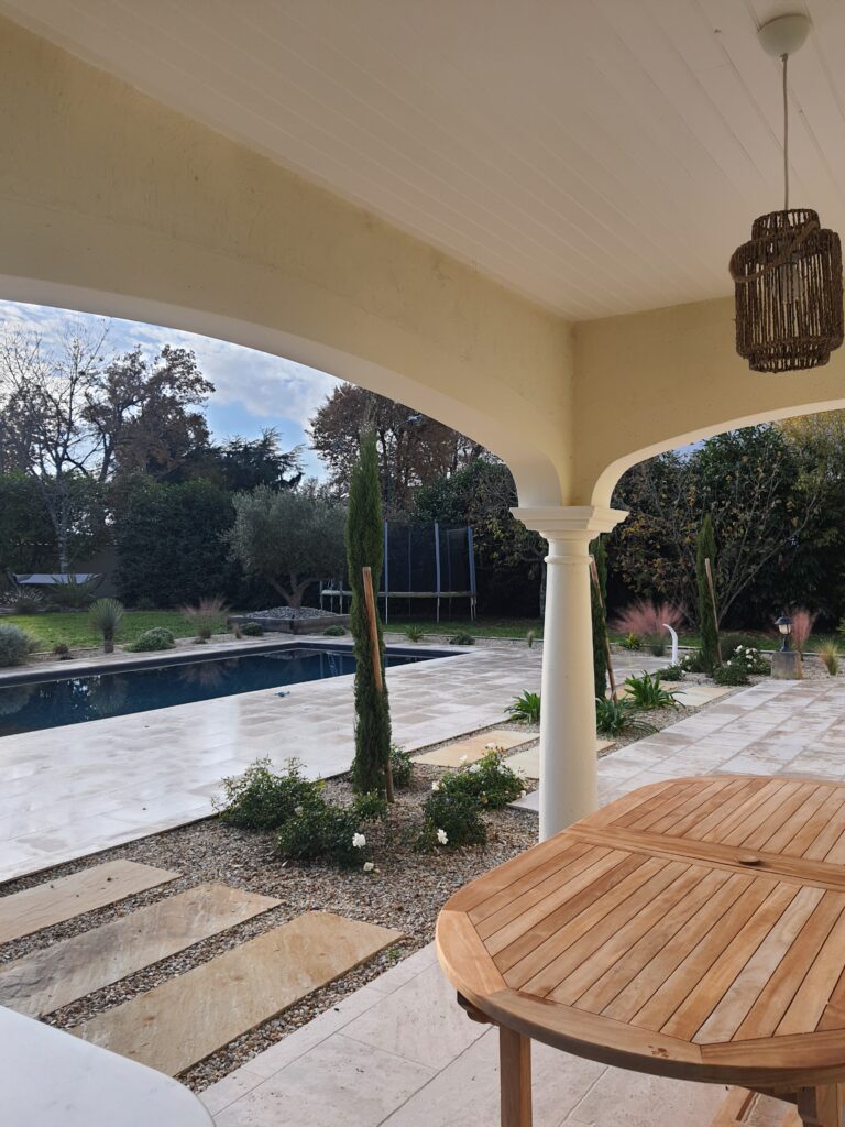 Dehors, l’aménagement paysager a fait l’objet d’une étude approfondie du terrain et des contraintes existantes. Une piscine a été créée en harmonie avec la façade et le jardin, accompagnée d’un terrain de pétanque et d’espaces de repos soigneusement intégrés dans la végétation. Les palmiers majestueux existants ont été mis en valeur, tandis que de nouvelles plantations adaptées au climat local viennent densifier et structurer l’ensemble pour une utilisation agréable toute l’année.