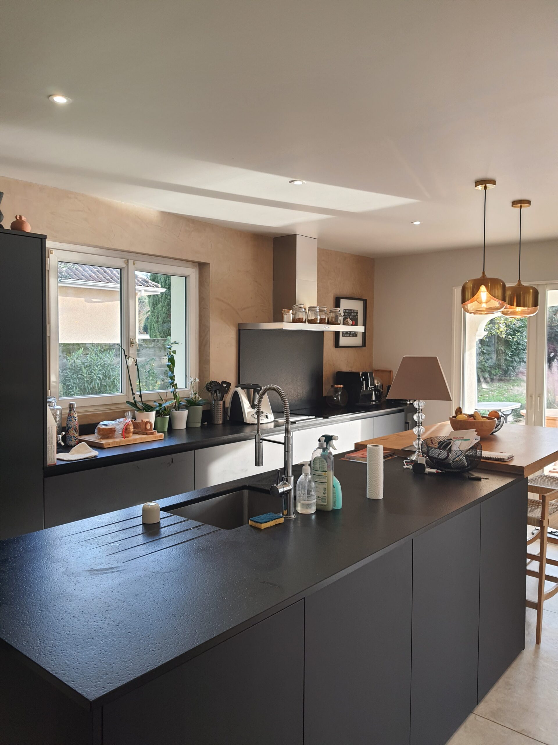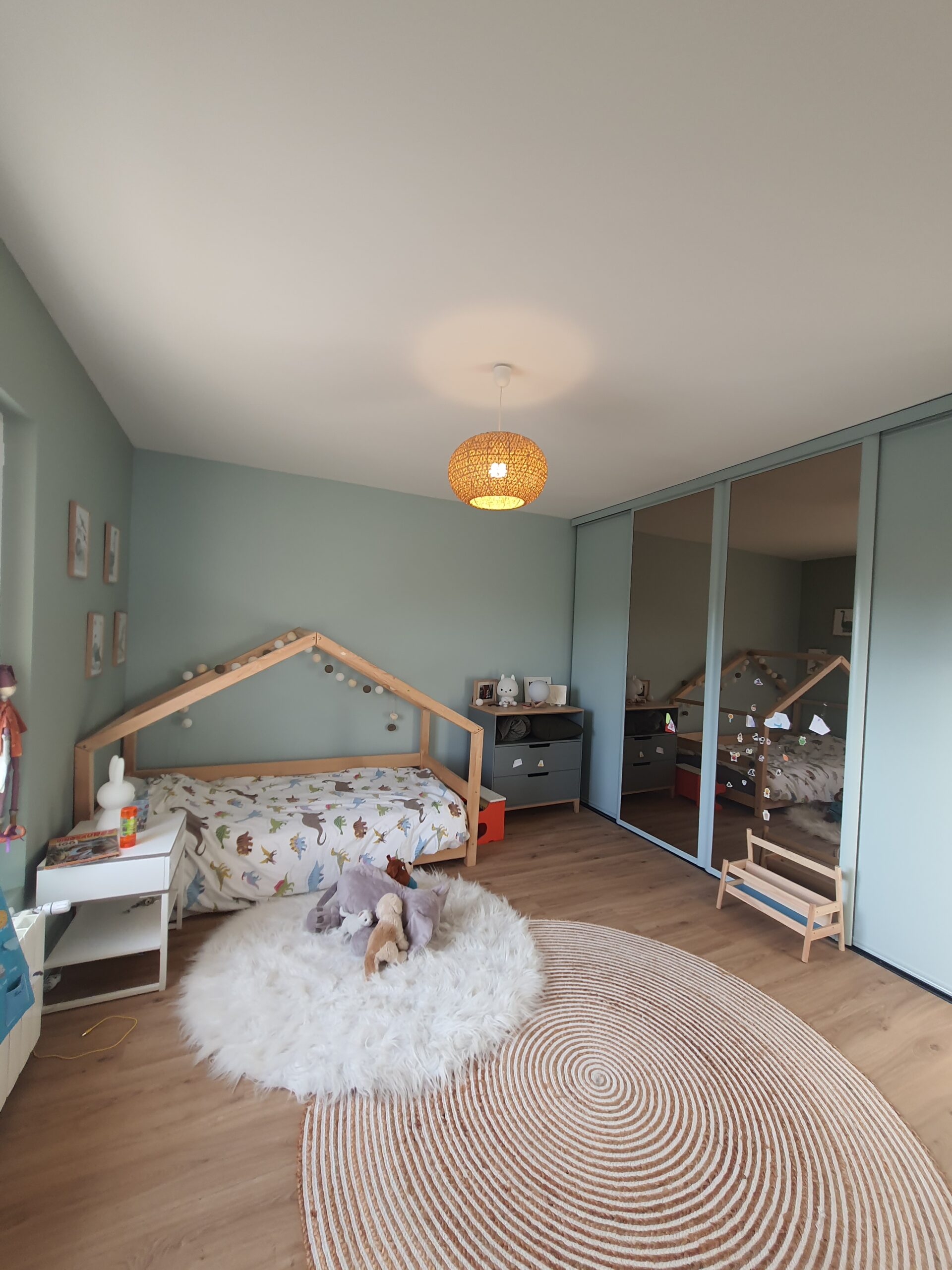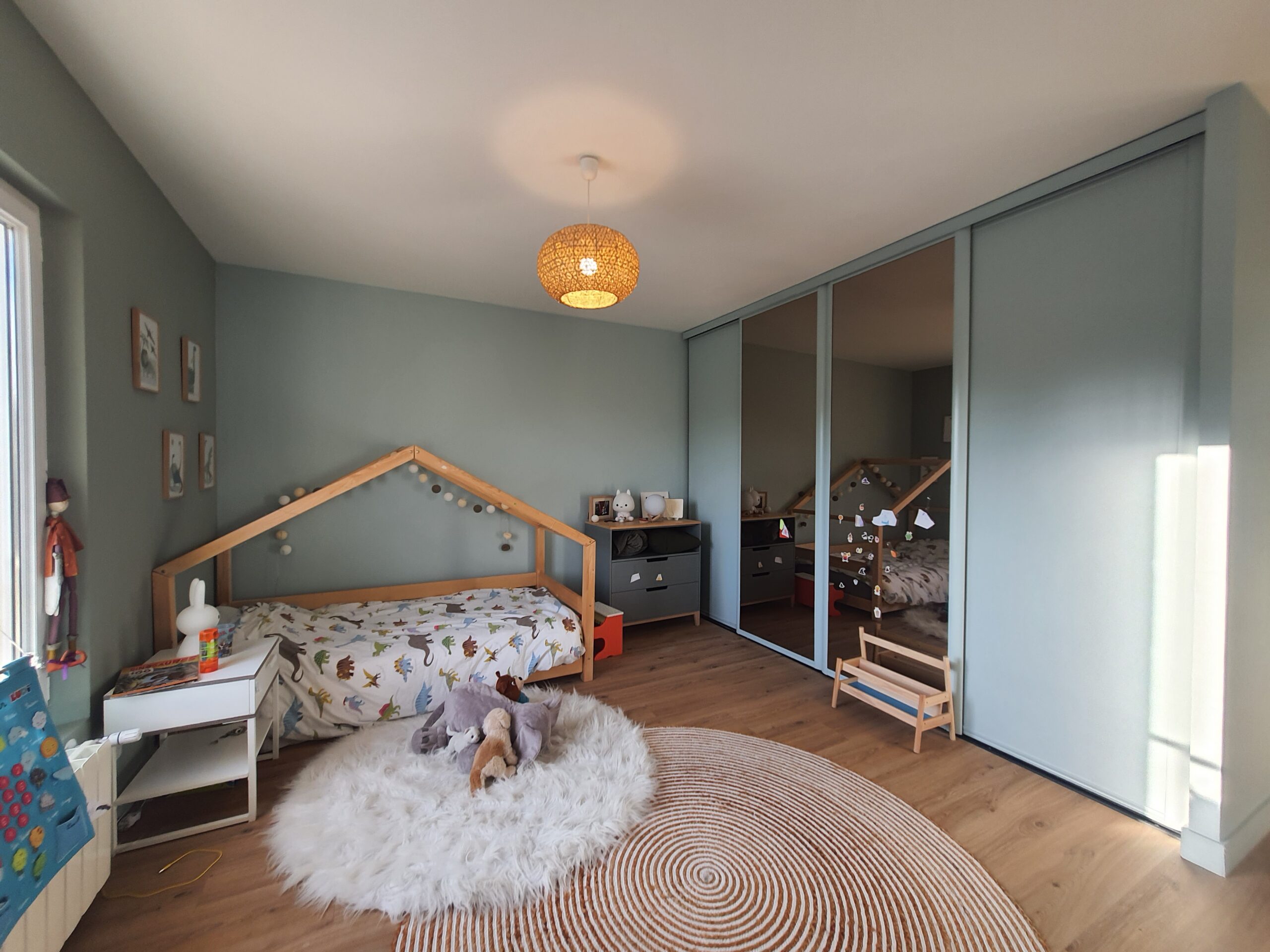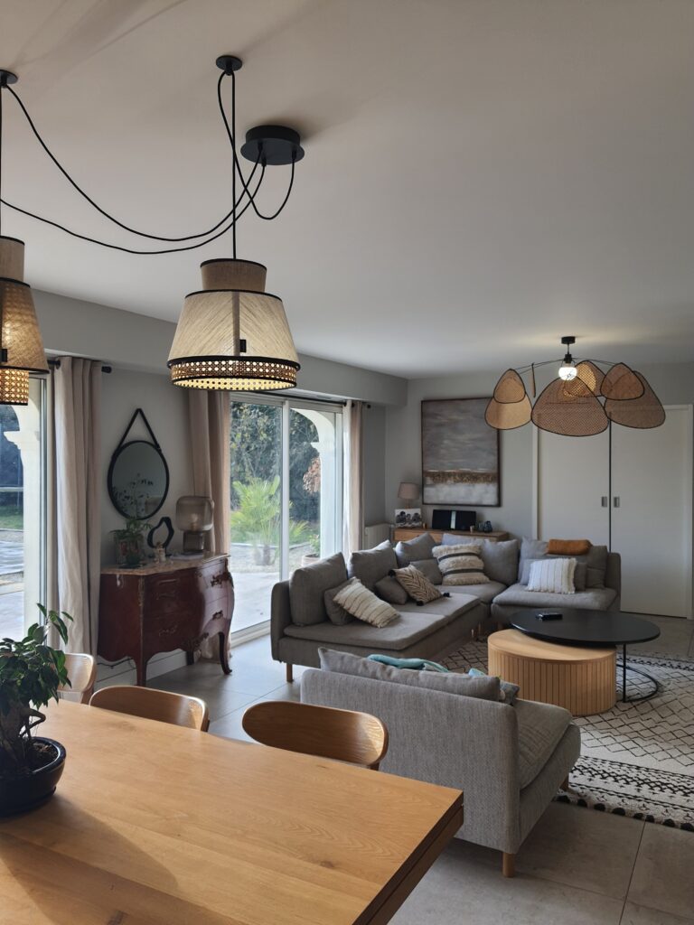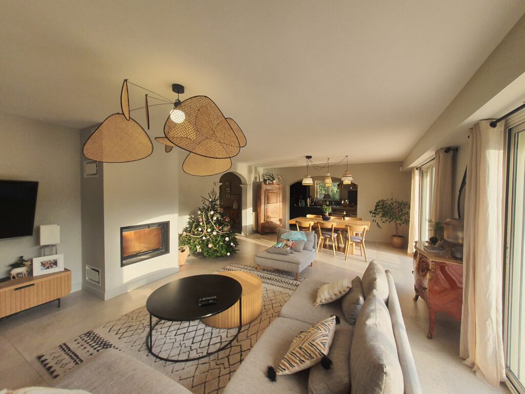 À l’intérieur, chaque espace a été repensé pour créer un intérieur cohérent, contemporain et chaleureux. Les pièces de vie adoptent une palette de tons naturels – beige, blanc cassé, vert sauge – avec des matières douces et des luminaires soigneusement choisis qui apportent caractère et confort. La chambre enfant, espiègle et poétique avec sa tête de lit en forme de maison, illustre la capacité d’ADK Architecture à concevoir des espaces adaptés à chaque membre de la famille. La cave à vin sur mesure, pensée jusque dans ses moindres détails, répond quant à elle aux exigences d’un amateur éclairé alliant fonctionnalité et esthétique.