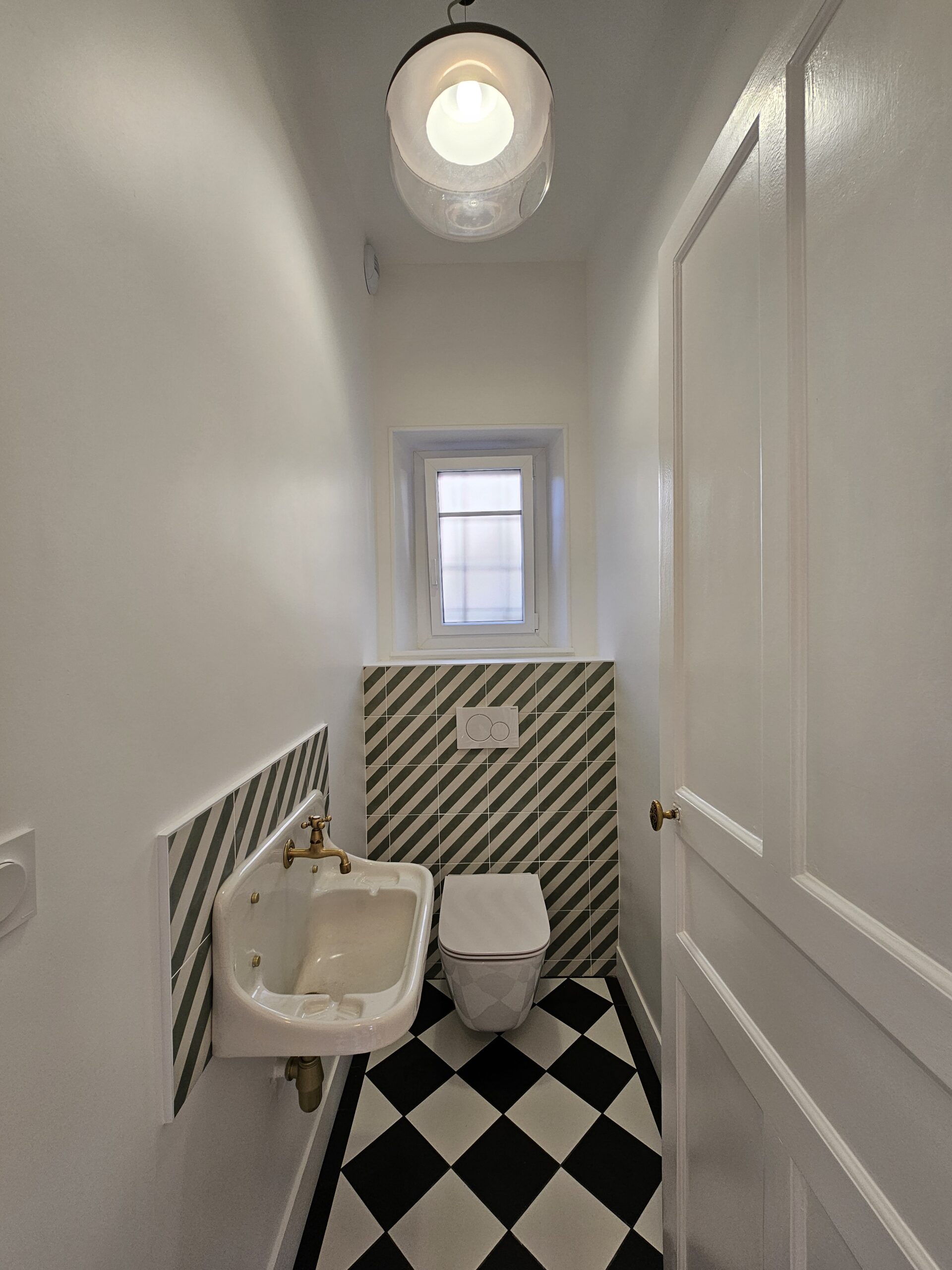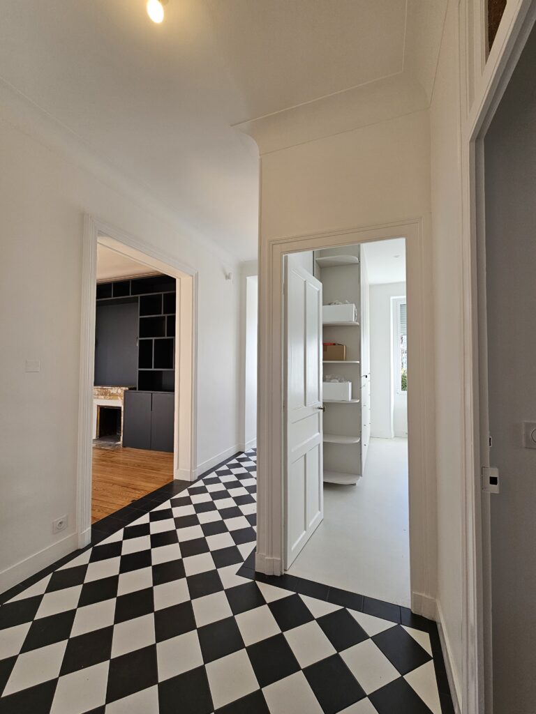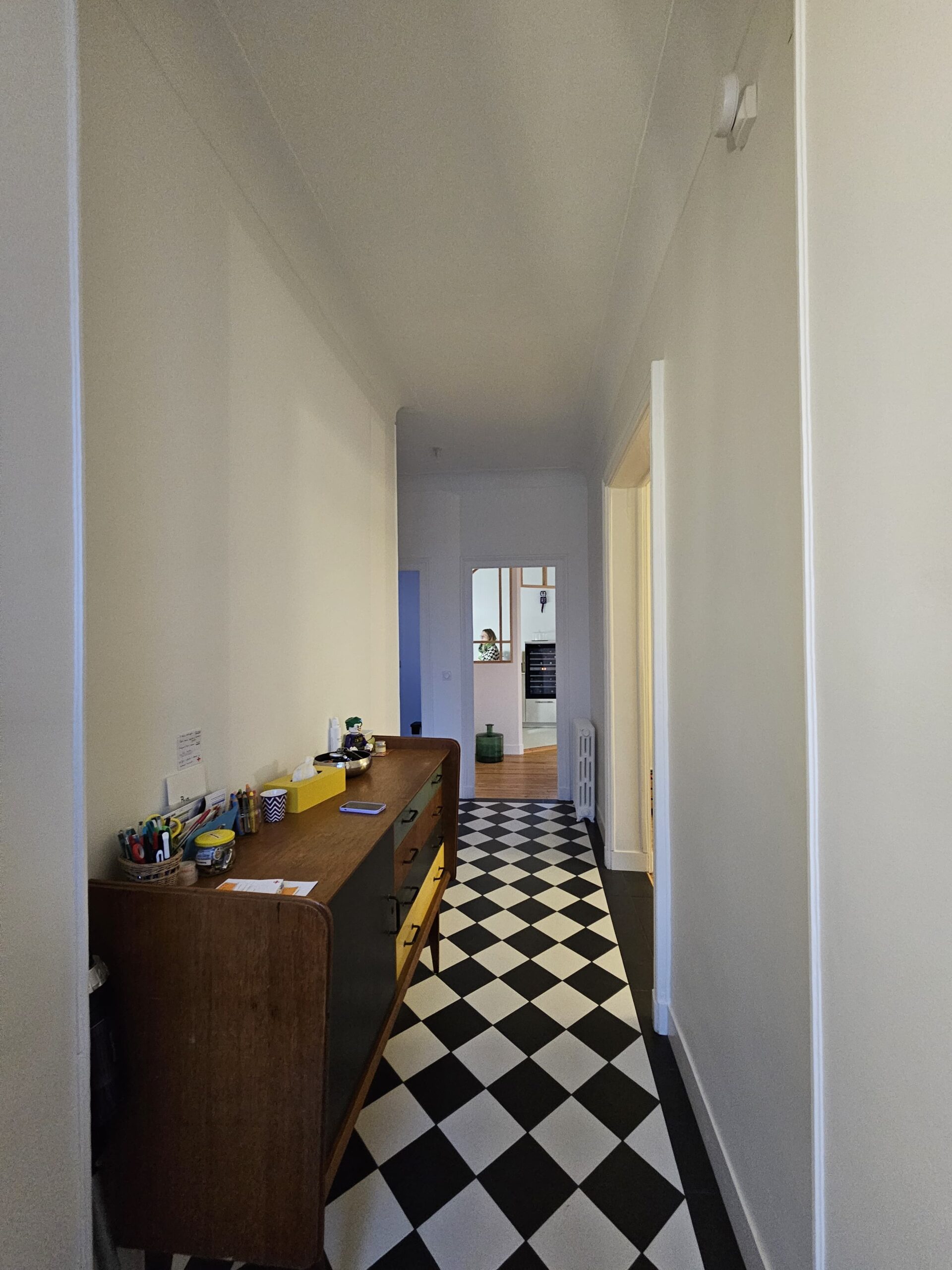 Le couloir d’entrée donne le ton dès le seuil : un carrelage damier noir et blanc grand format remplace l’ancien revêtement, apportant immédiatement un caractère graphique et contemporain qui traverse toute la maison.