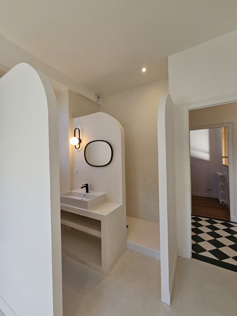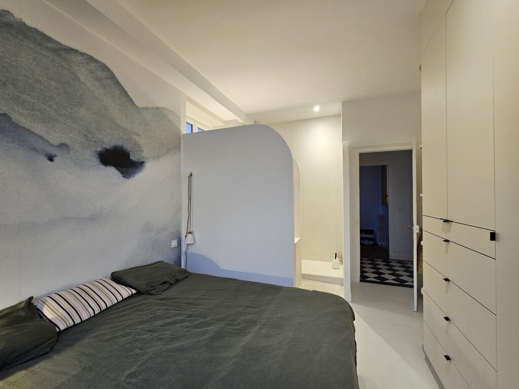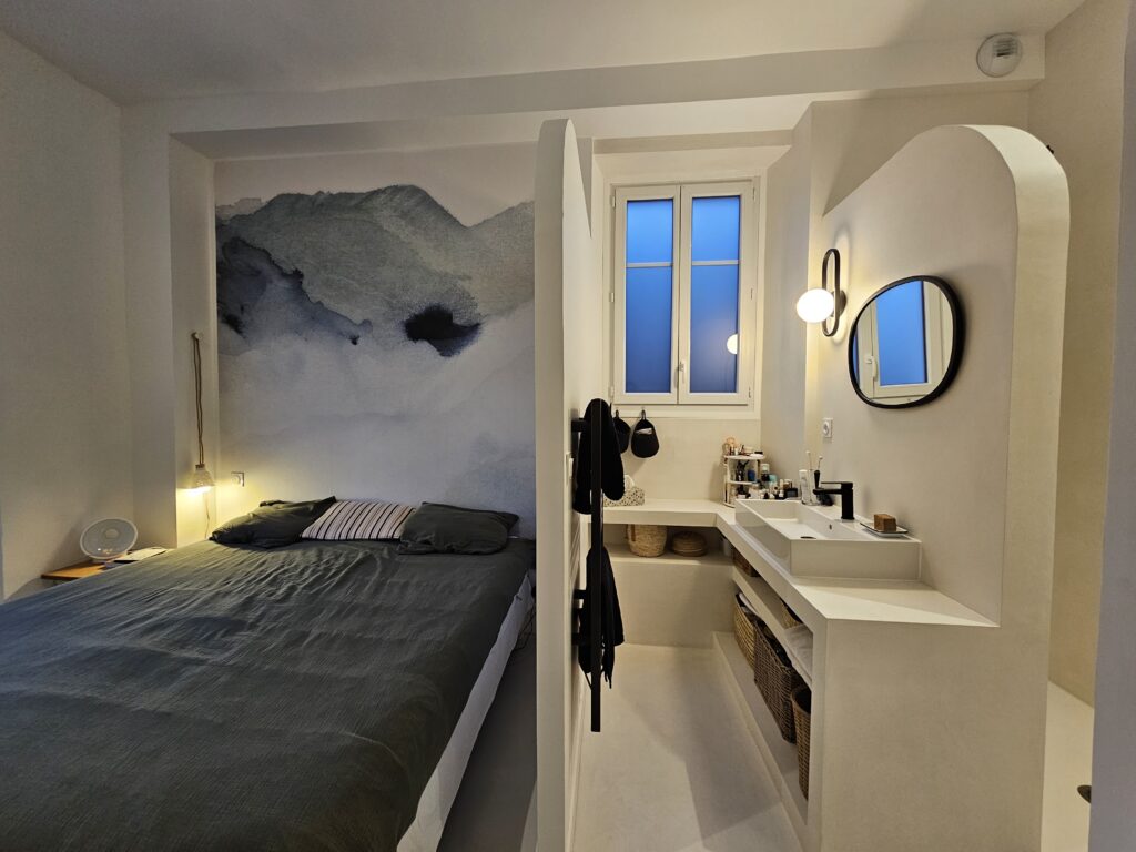 La chambre parentale est sans doute la pièce la plus poétique du projet. Un papier peint panoramique aquarelle aux tons bleu-gris évoquant les montagnes pyrénéennes habille le mur de tête de lit. Une arche en enduit blanc sépare délicatement la chambre de sa salle d’eau intégrée – sol en béton ciré blanc, vasque à poser, miroir rond noir – dans une atmosphère presque méditerranéenne.