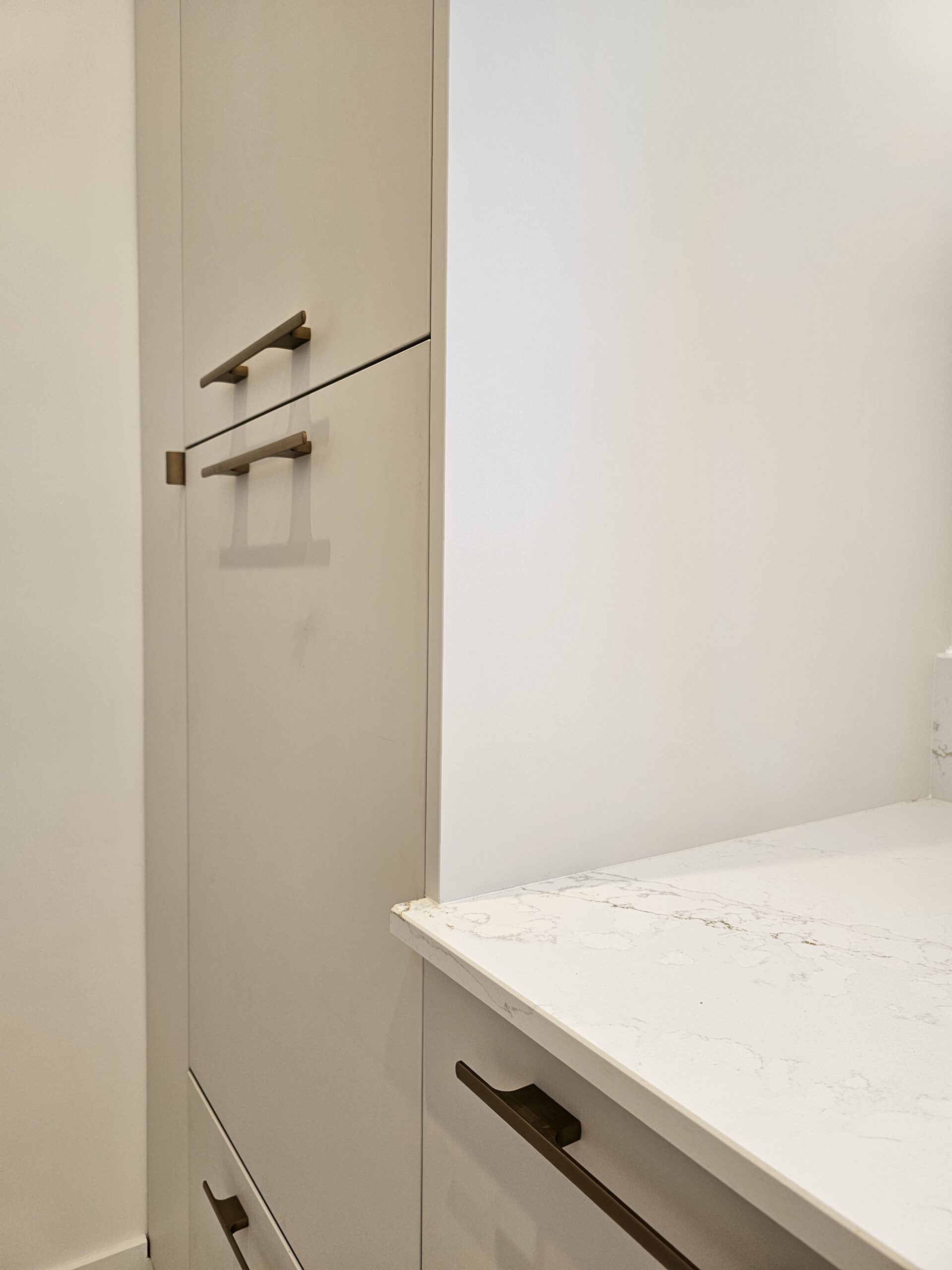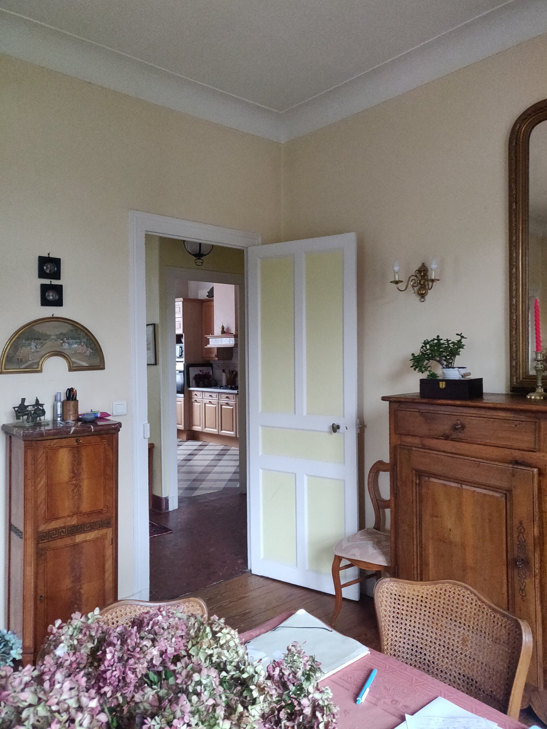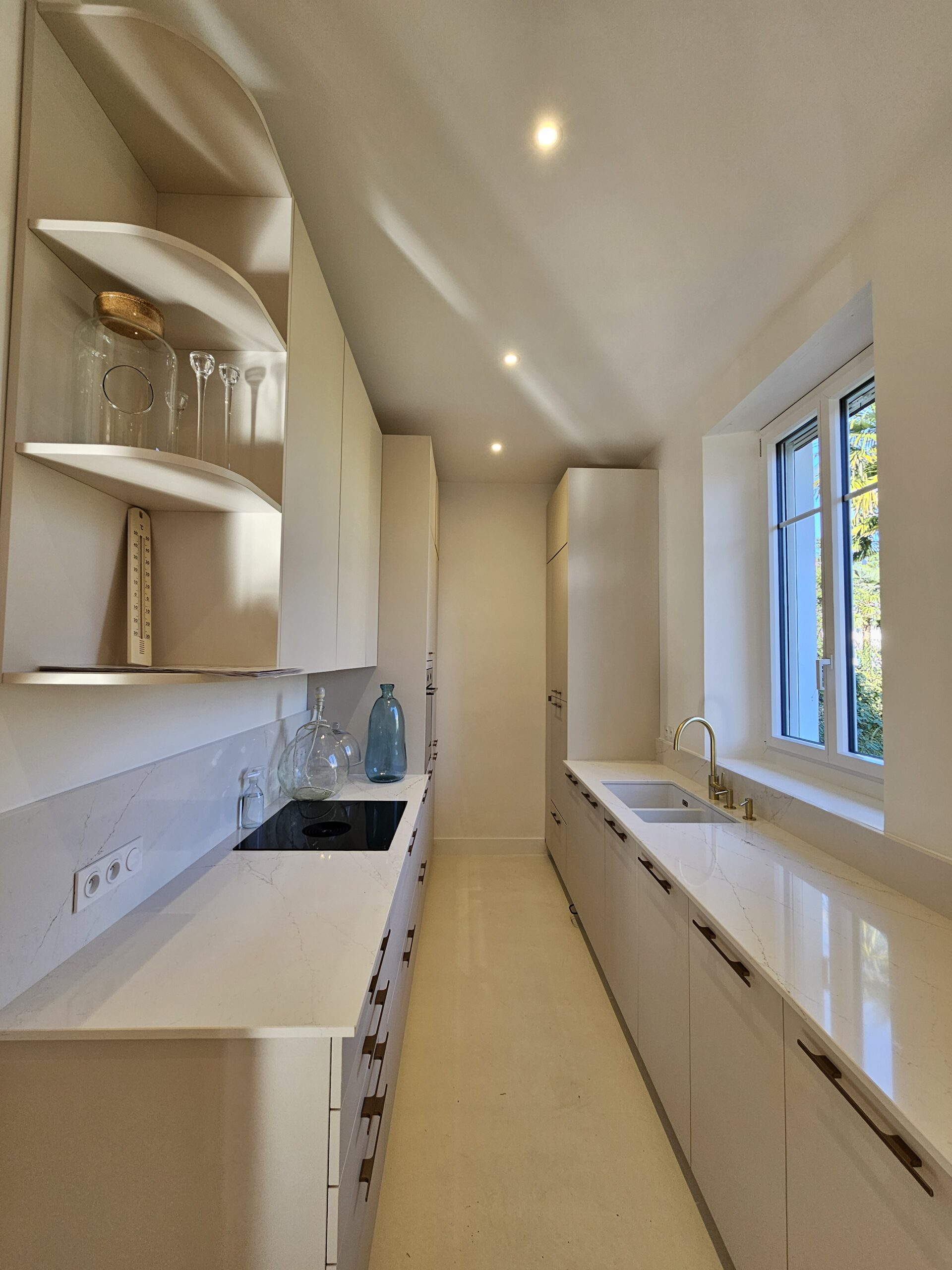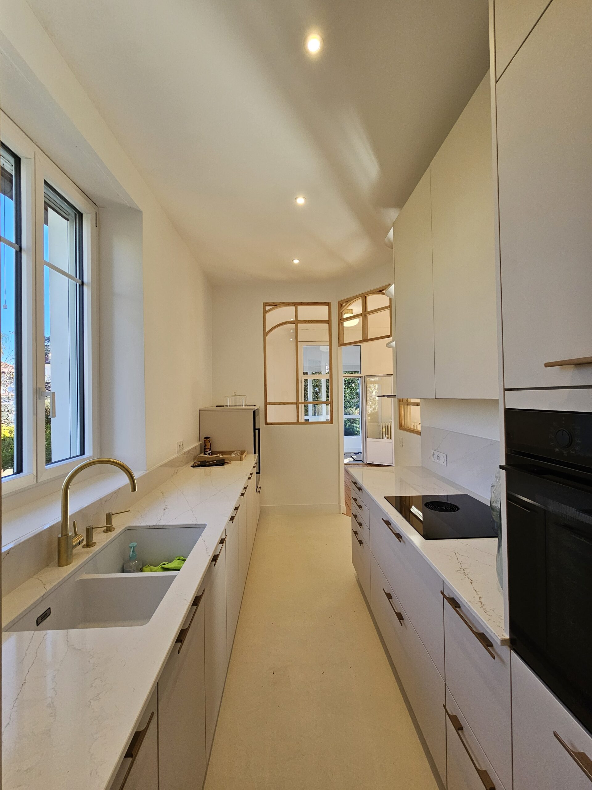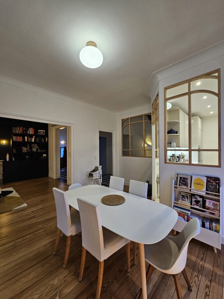 La salle à manger s’ouvre sur la cuisine grâce à une élégante verrière en bois chêne doré, solution lumineuse qui sépare les espaces sans les fermer. La cuisine, entièrement repensée en blanc laqué épuré avec cave à vin intégrée et robinetterie dorée, offre un espace de travail fonctionnel et raffiné.