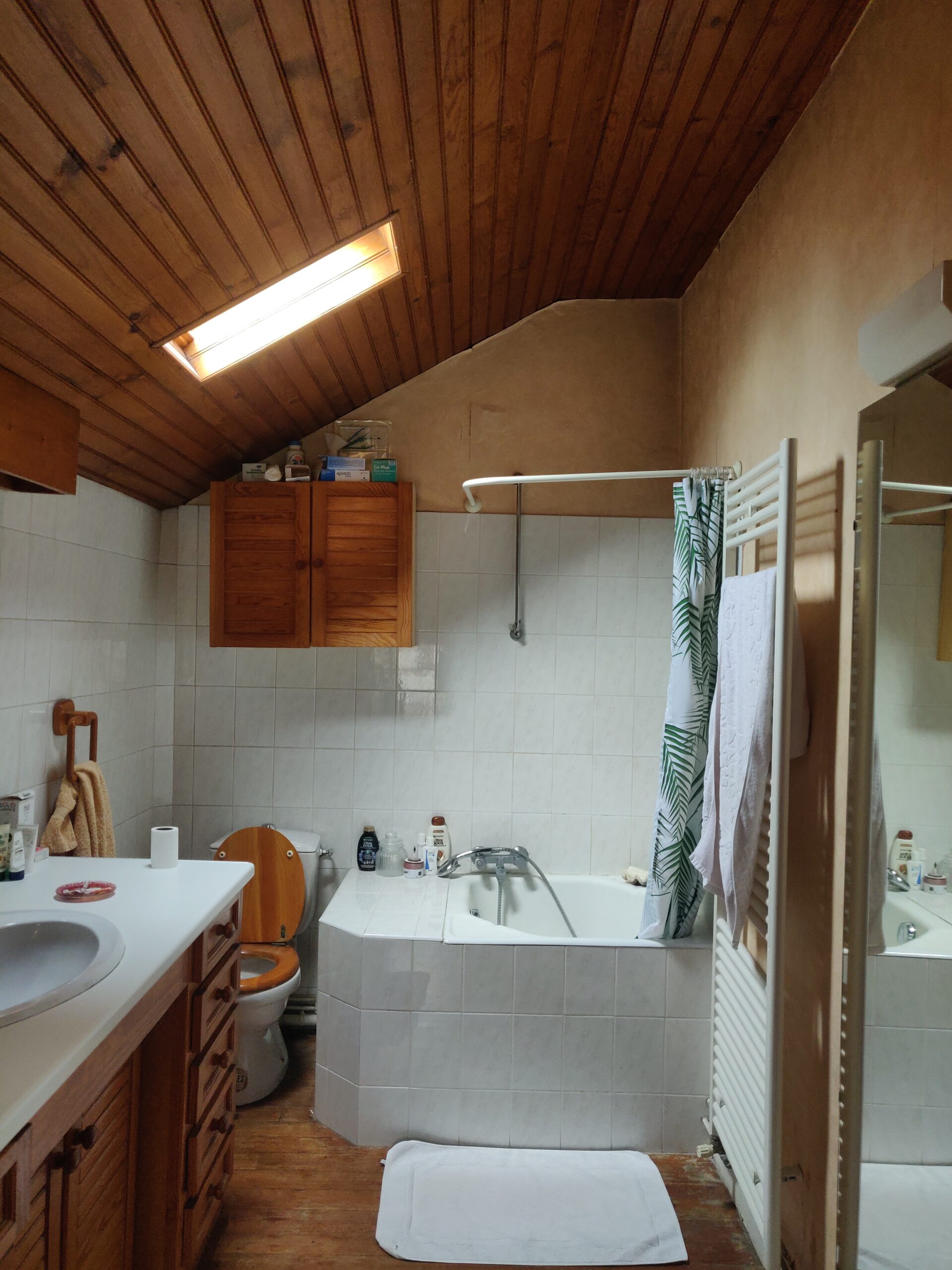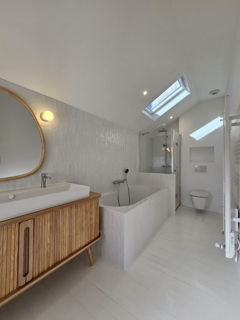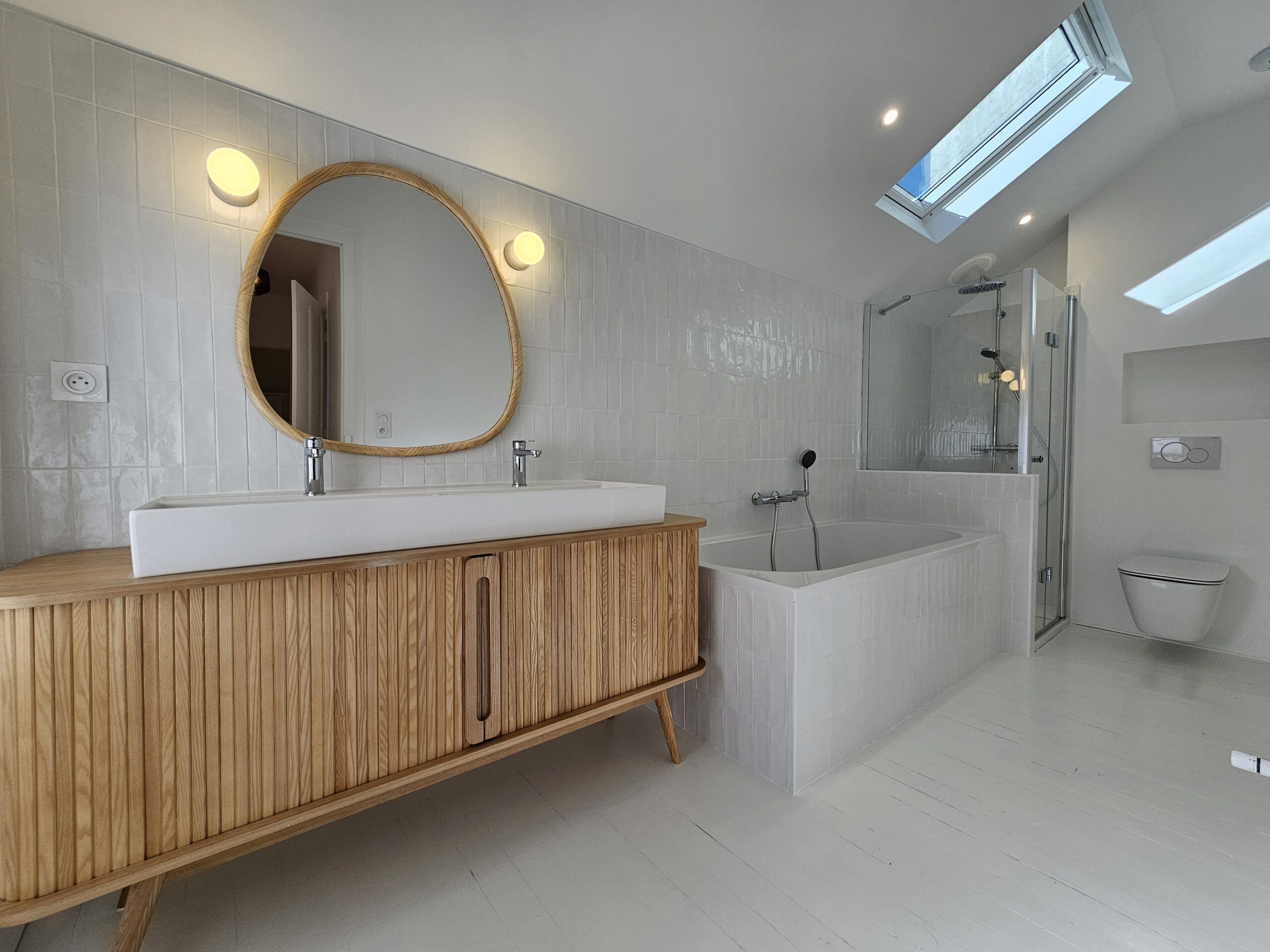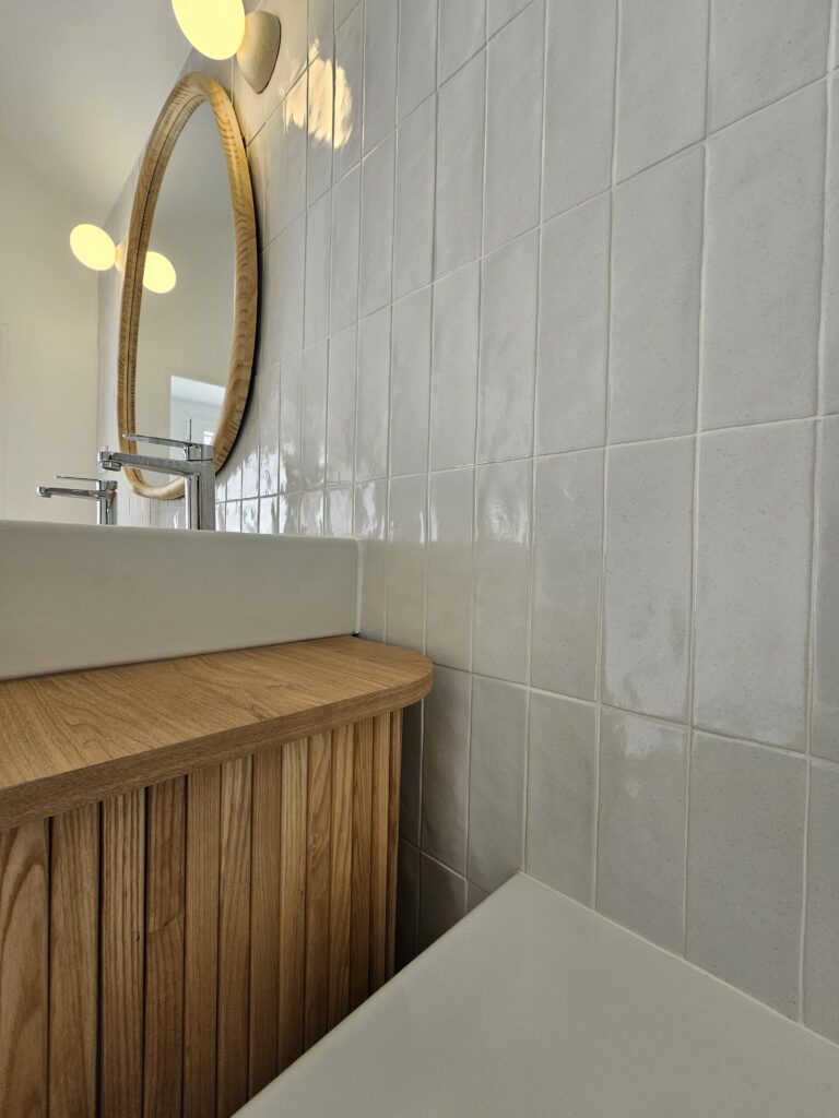 Les salles de bain, entièrement refaites, adoptent un style rétro-contemporain assumé : carrelage blanc brillant en pose verticale, baignoire avec tablier en lattes de bois sur pieds, meuble vasque bois vintage, miroir ovale doré. Les chambres enfants, lumineuses et joyeuses, ont été pensées avec soin – chacune avec sa propre personnalité, entre mobilier chiné et décoration douce.