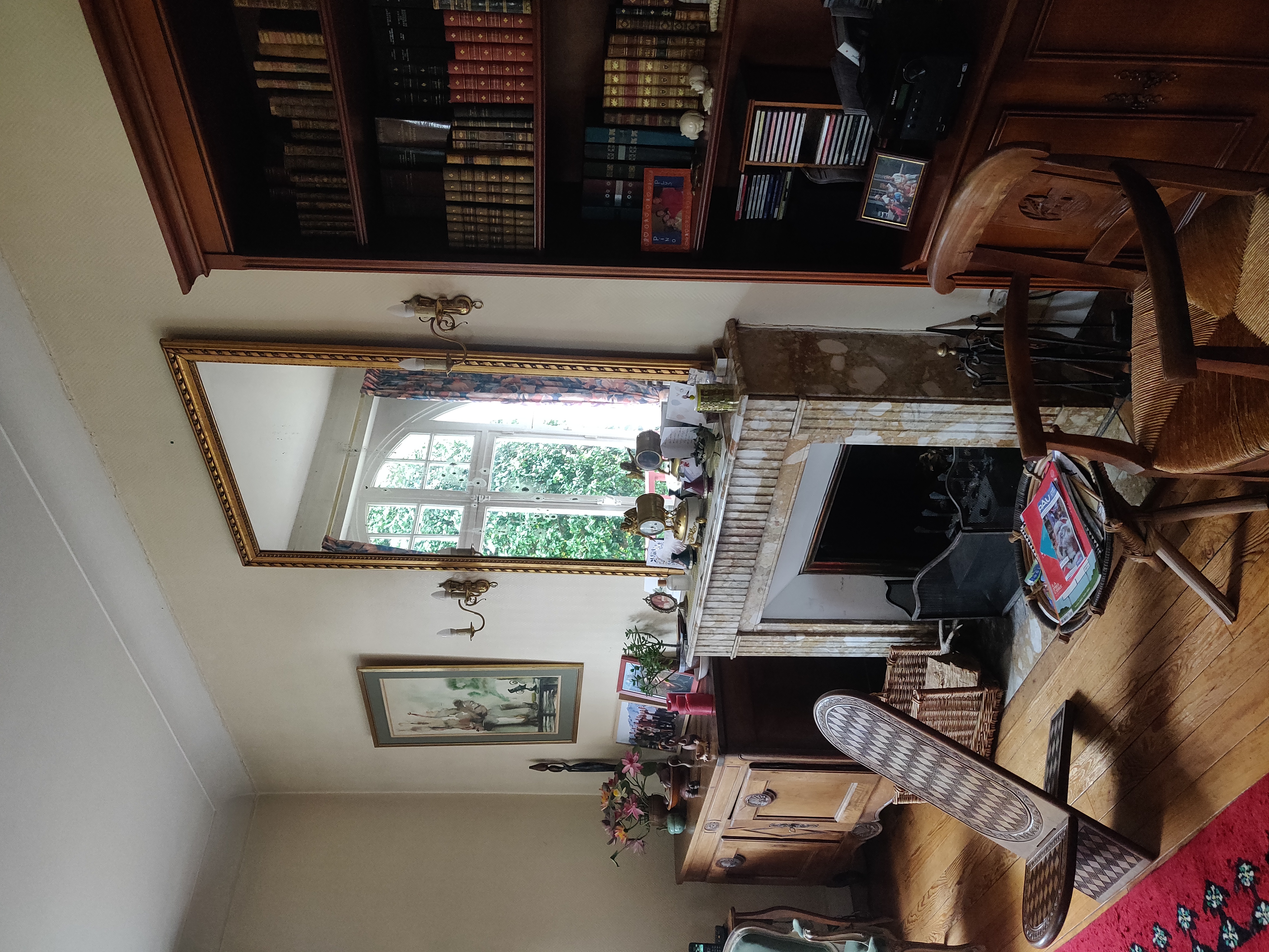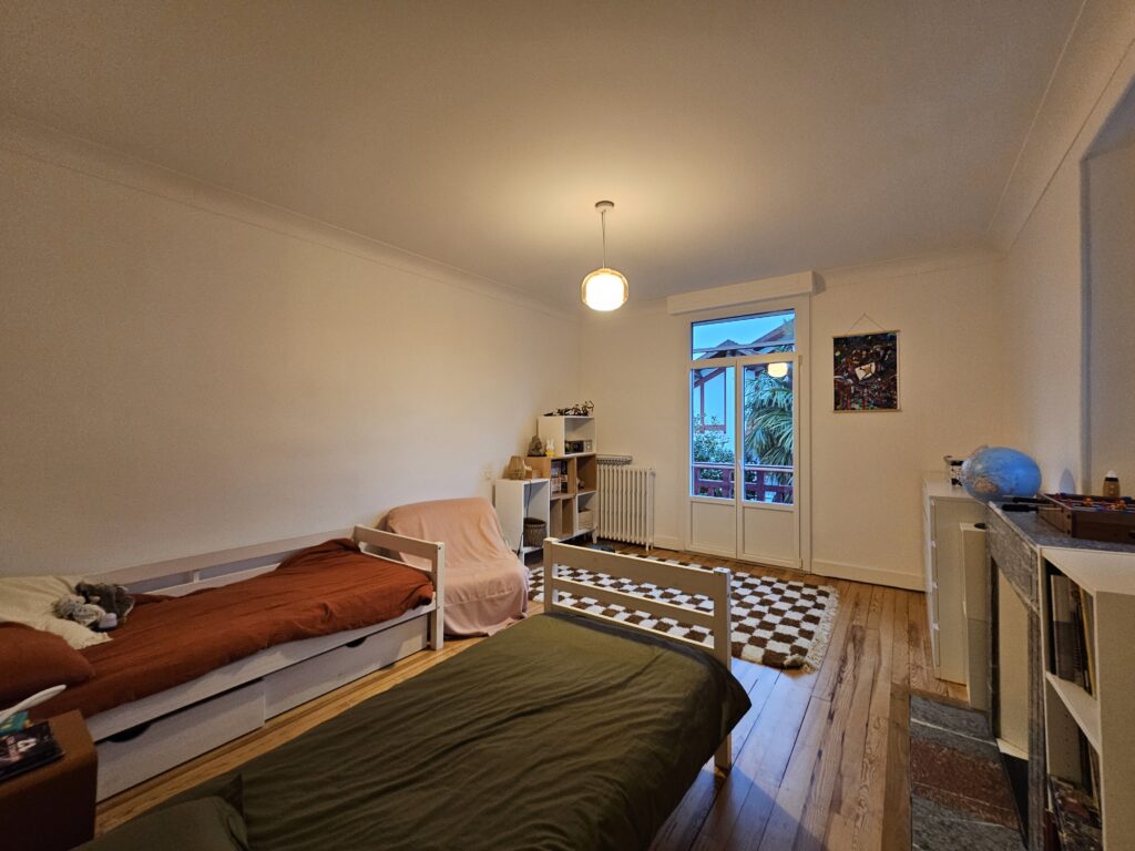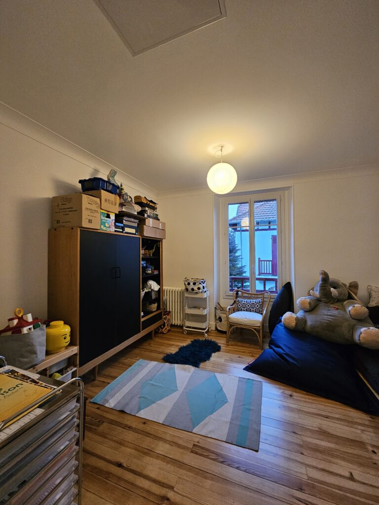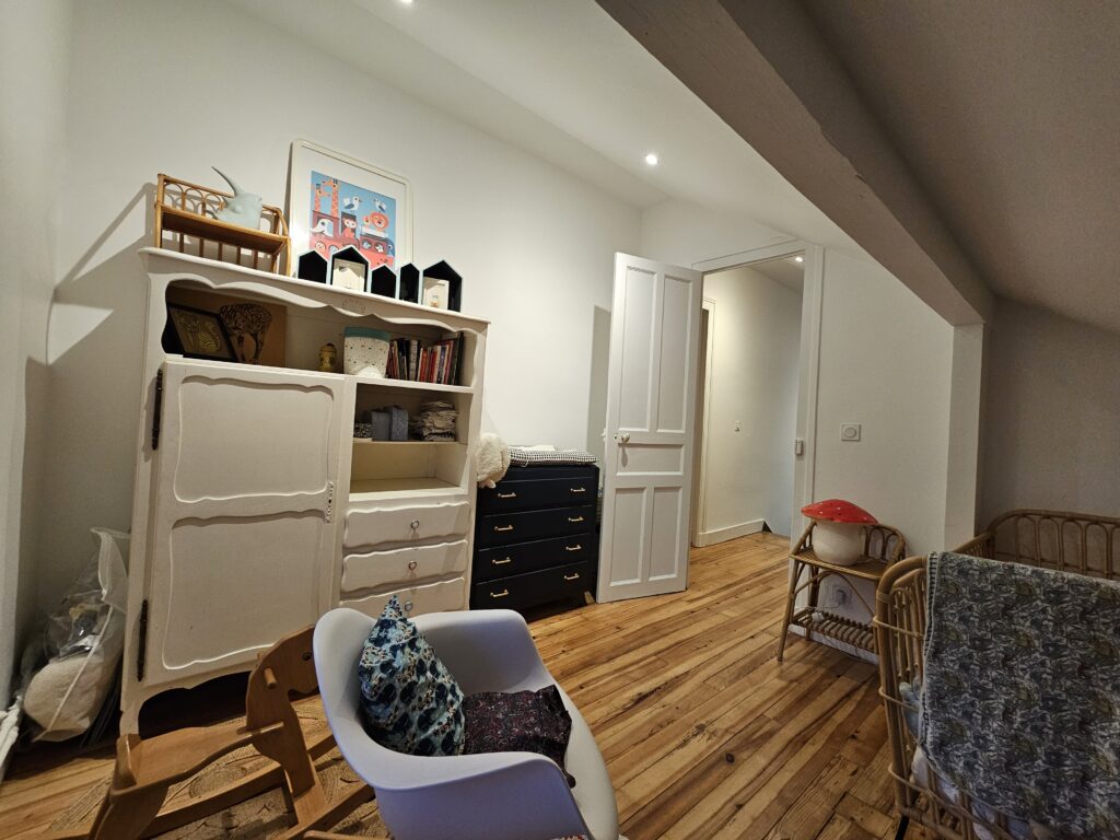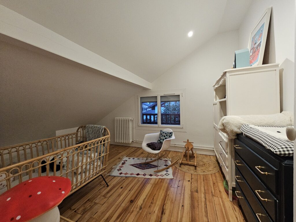 Les salles de bain, entièrement refaites, adoptent un style rétro-contemporain assumé : carrelage blanc brillant en pose verticale, baignoire avec tablier en lattes de bois sur pieds, meuble vasque bois vintage, miroir ovale doré. Les chambres enfants, lumineuses et joyeuses, ont été pensées avec soin – chacune avec sa propre personnalité, entre mobilier chiné et décoration douce.