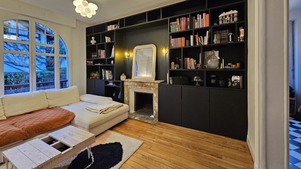 Le salon est structuré par une bibliothèque sur mesure noire monumentale, conçue sur toute la hauteur et la largeur du mur, encadrant harmonieusement la cheminée existante conservée comme pièce de patrimoine. Le parquet bois clair, la suspension bulle et le canapé blanc créent un équilibre parfait entre sophistication et confort.