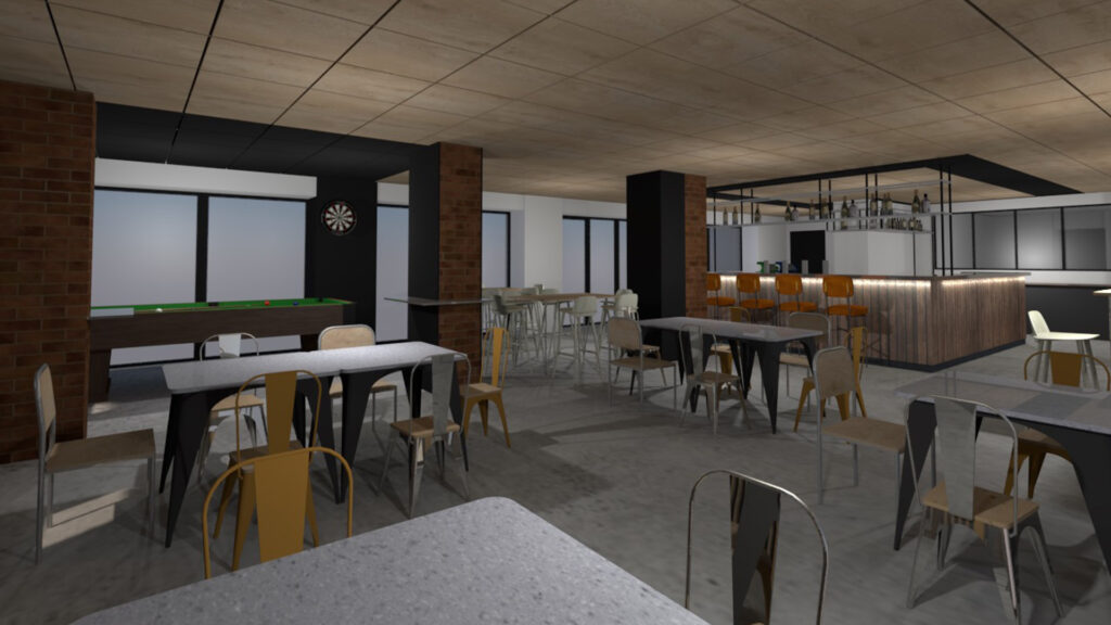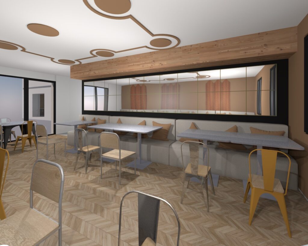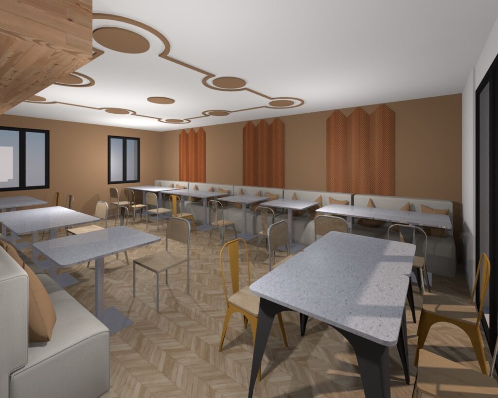 La réflexion a porté sur l’organisation globale des espaces : optimisation de la salle principale, fluidité des circulations, valorisation du bar et création de différentes ambiances au sein d’un même volume. Une attention particulière a également été accordée à la fonctionnalité, afin de garantir une cohérence entre l’espace clients et les contraintes d’exploitation quotidienne.