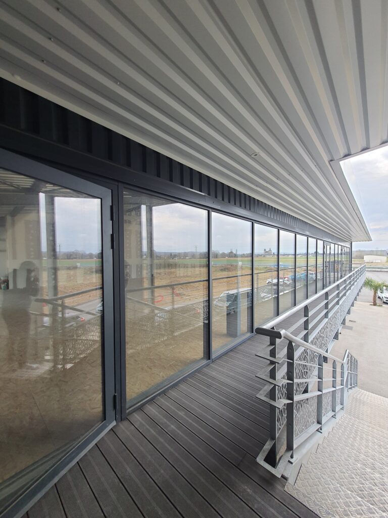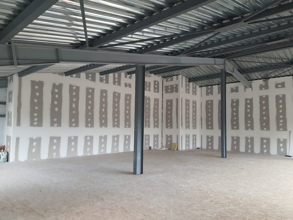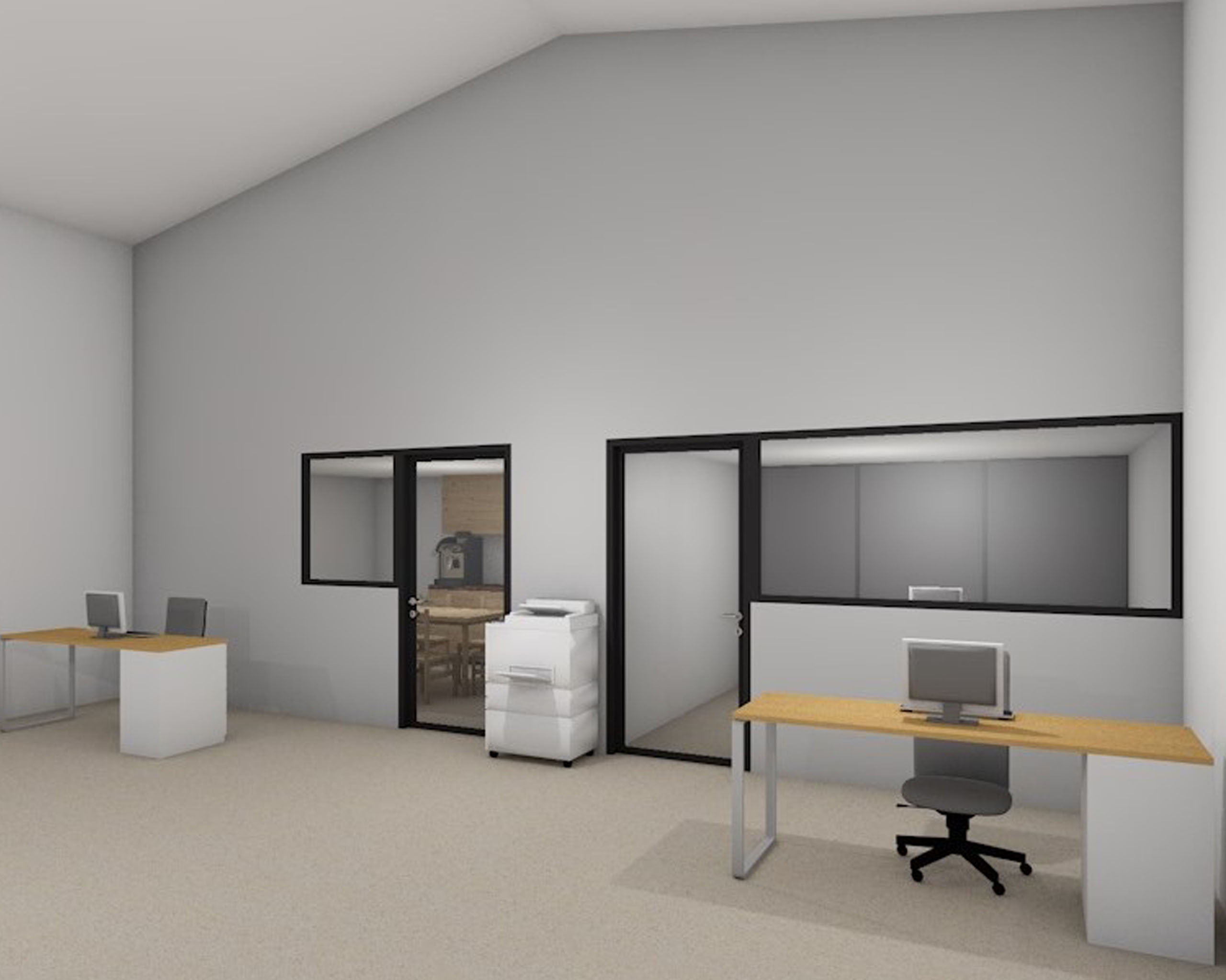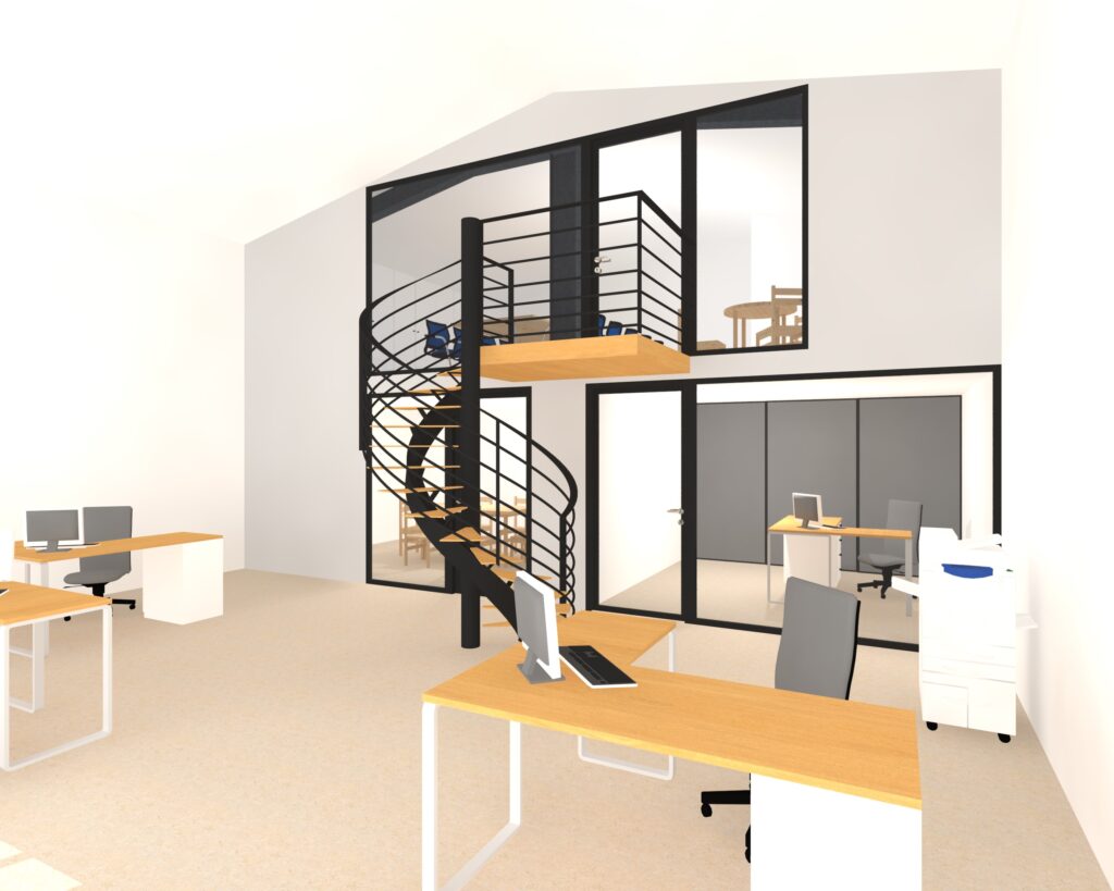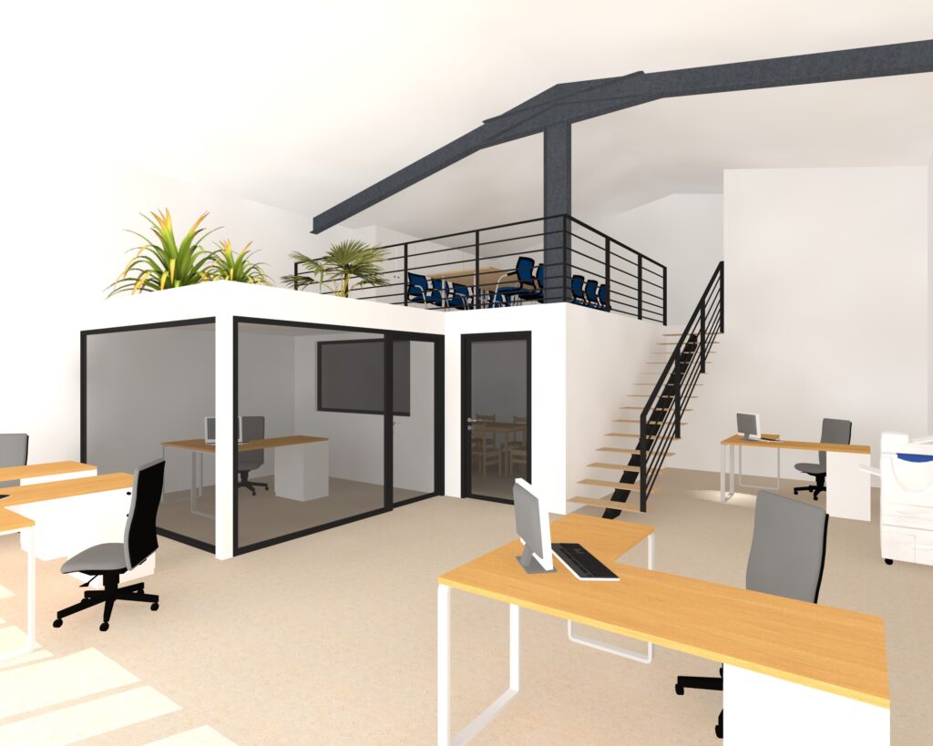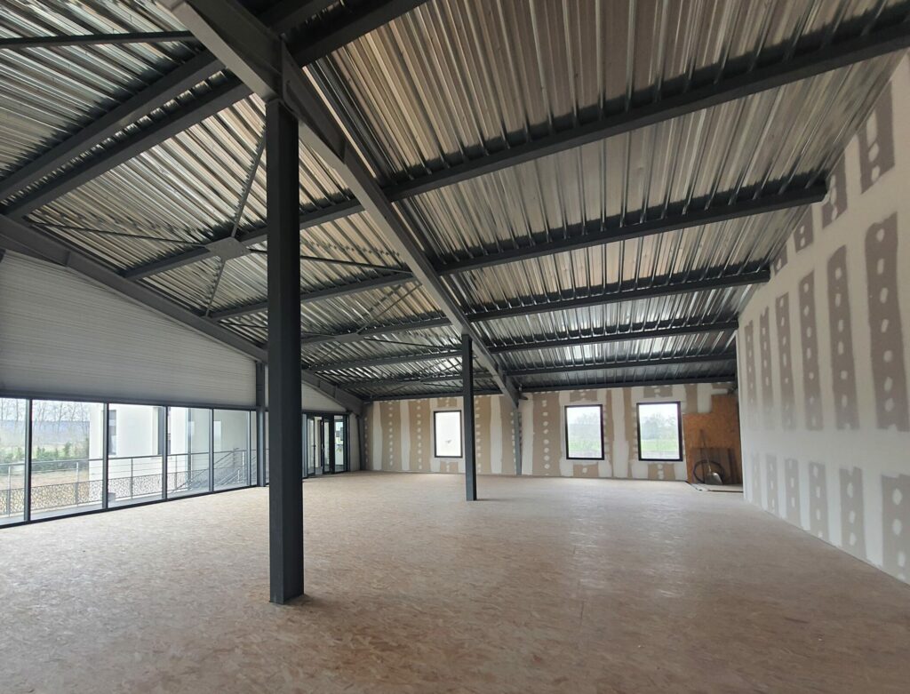 La hauteur sous plafond importante du hangar représentait une opportunité majeure. Nous avons donc étudié, en option, la possibilité d’un aménagement en R+1, permettant d’exploiter pleinement le volume disponible et d’anticiper les besoins futurs d’extension. Cette réflexion a été intégrée dès la phase de conception afin de garantir la faisabilité technique et la cohérence architecturale du projet.